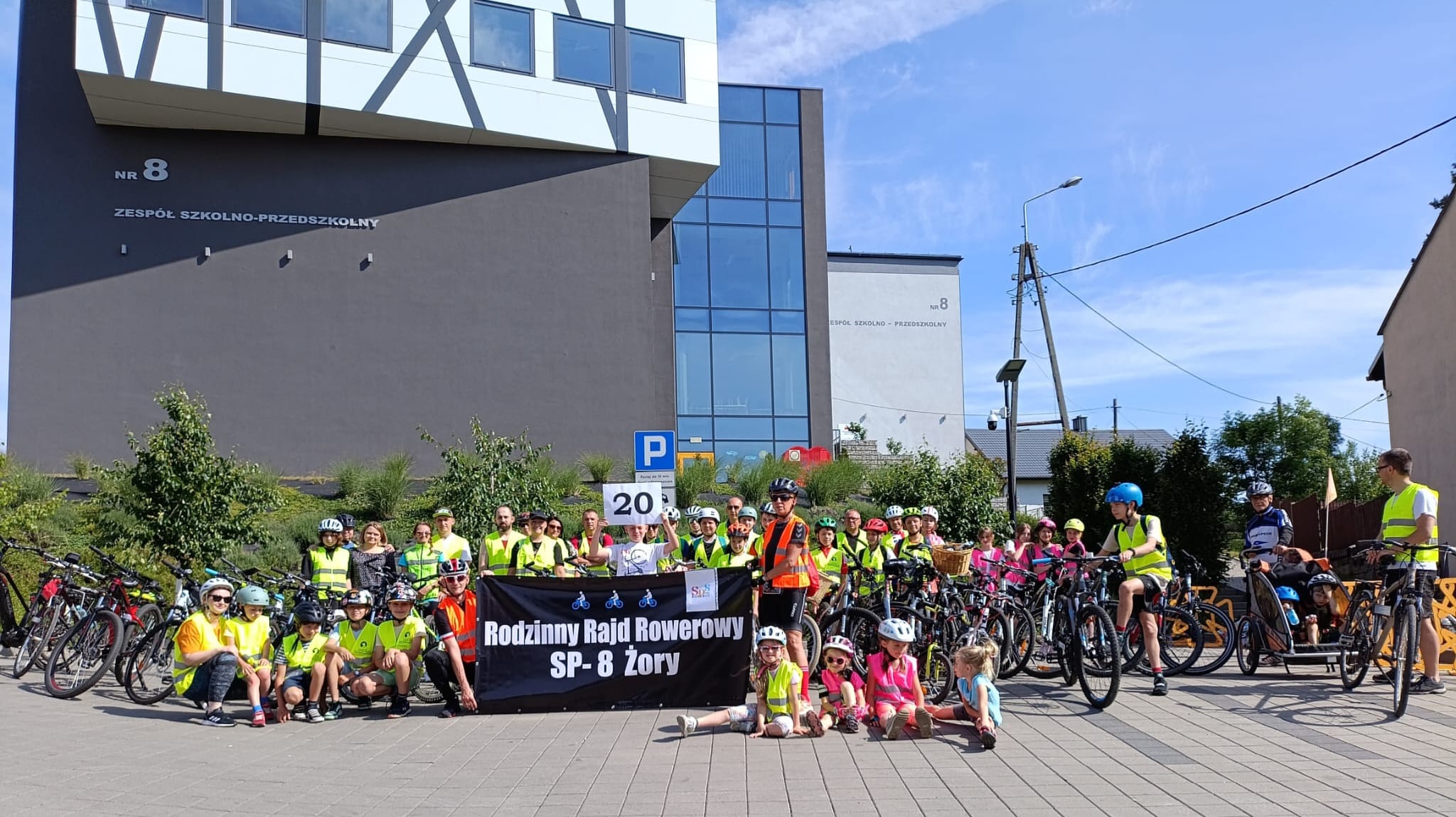Na zdjęciu: Uczestnicy 20 Jubileuszowego Rowerowego Rajdu Rodzinnego na tle szkoły ZSP8