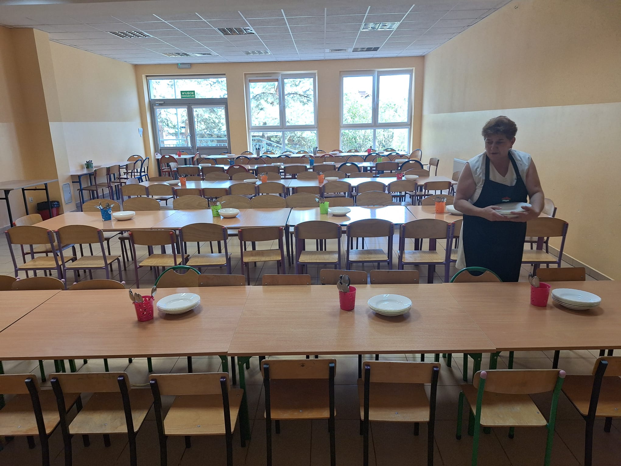 Na zdjęciu: stołówka szkolna, w której Pani kucharka przygotowuje nakrycia na stół.