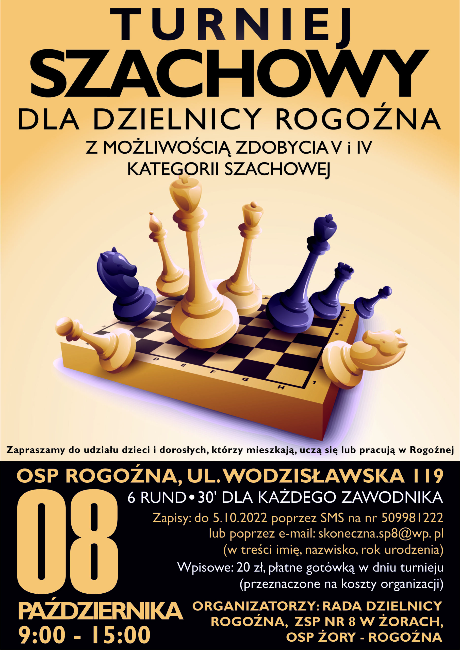 Turniej Szachowy dla mieszkańców Rogoźnej Posted on 21 września 2022 by szkola8zory Posted in Bez kategorii wykonawcą plakatu jest pani Kinga Jacek