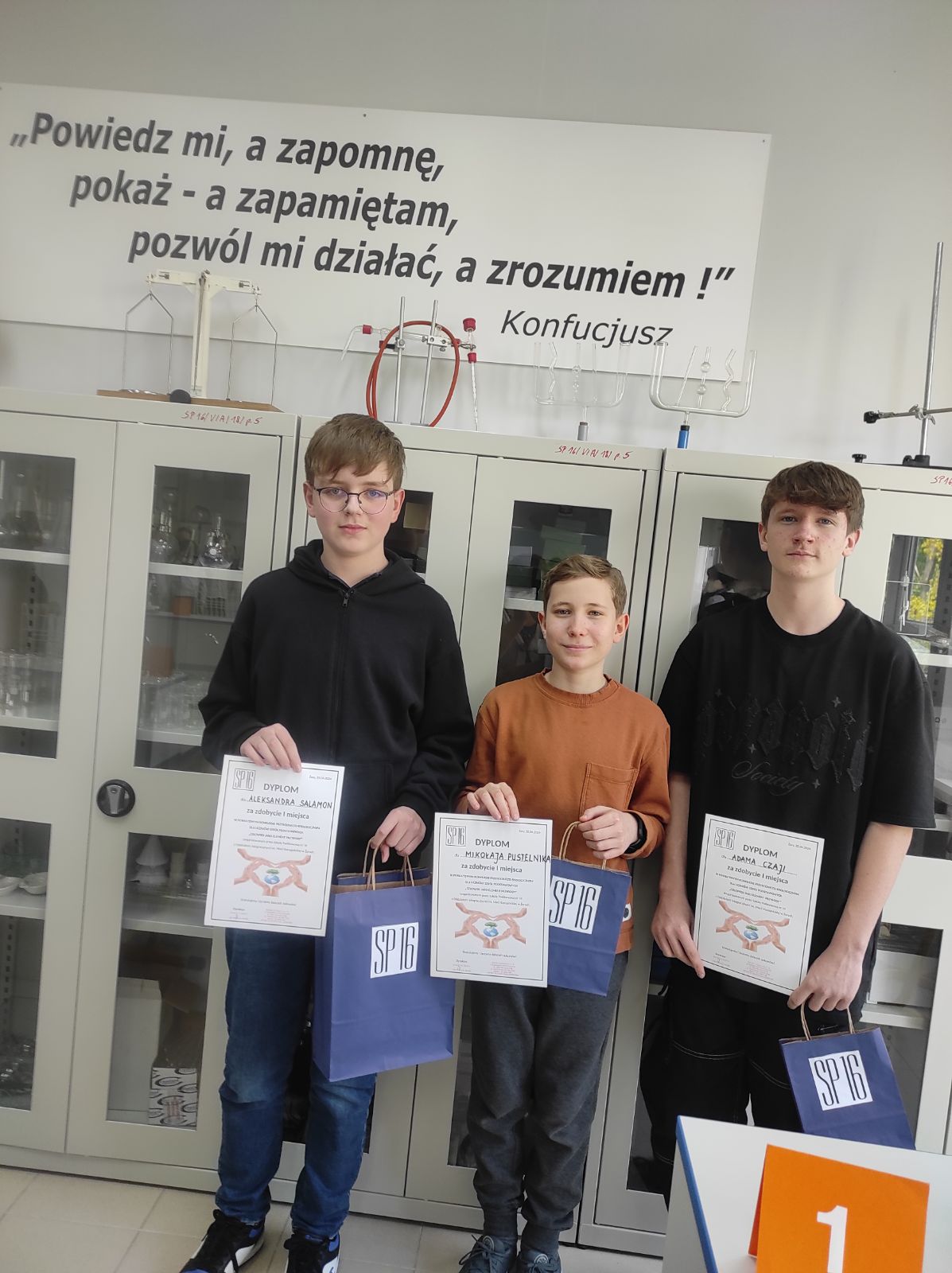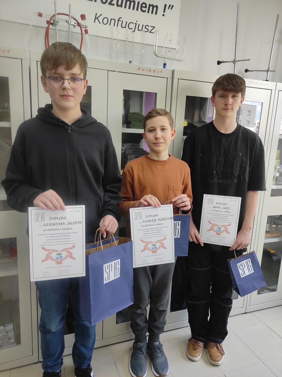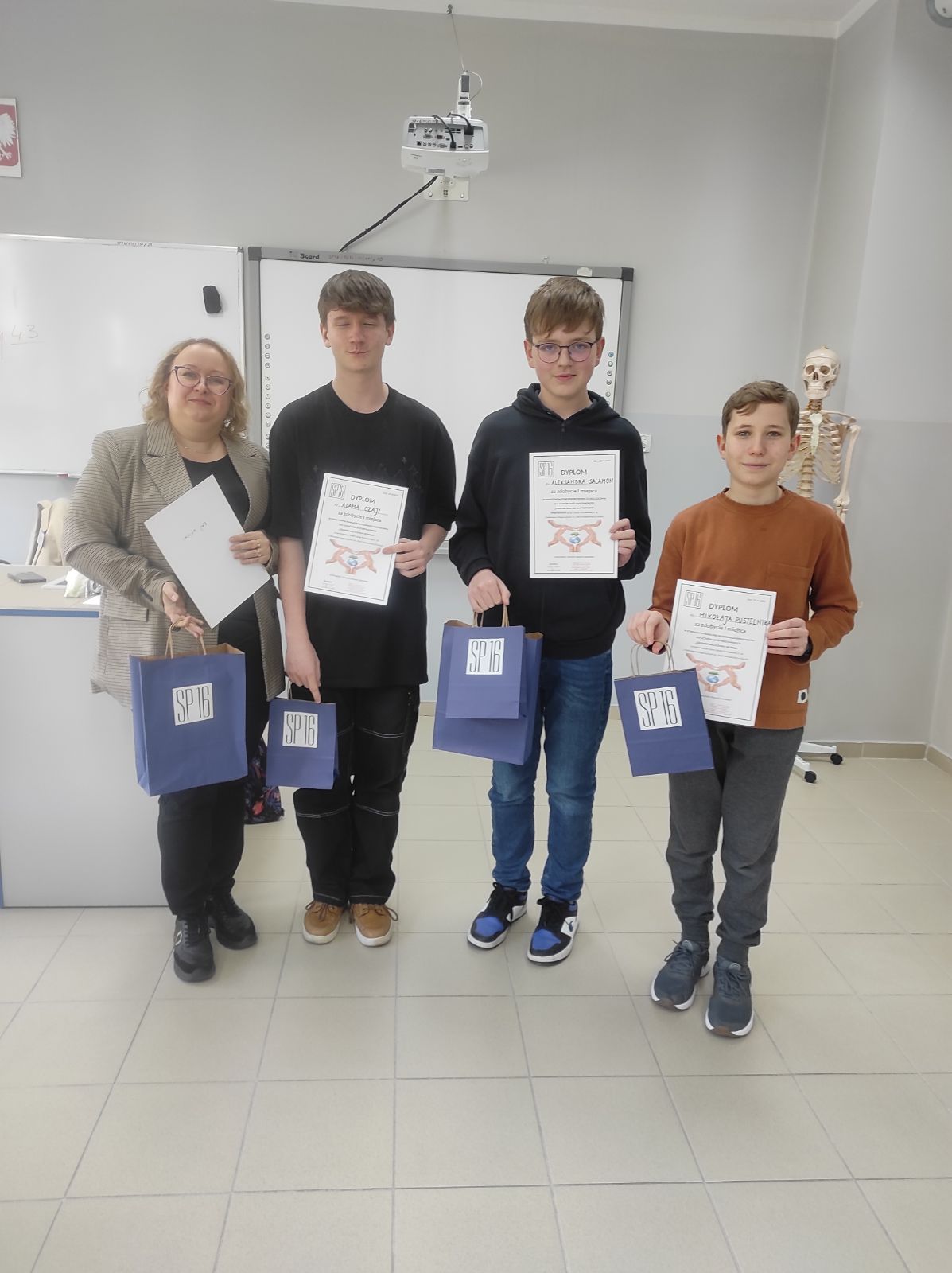 Miło nam poinformować, że nasi uczniowie: Aleksander S., Mikołaj P., Adam Cz. zdobyli I miejsce w Powiatowym Konkursie Przyrodniczo – Ekologicznym dla Uczniów Szkół Podstawowych „Człowiek Jako Element Środowiska”, który odbył się w SP 16 w Żorach. Uczestnicy wykazali się szeroką wiedzą z zakresu fizyki, chemii, geografii i biologii. Spośród wszystkich uczestników, uczeń klasy 7, Aleksander S., otrzymał specjalne wyróżnienie za najwięcej uzyskanych punktów w teście wiedzy, który był częścią składową całego konkursu.