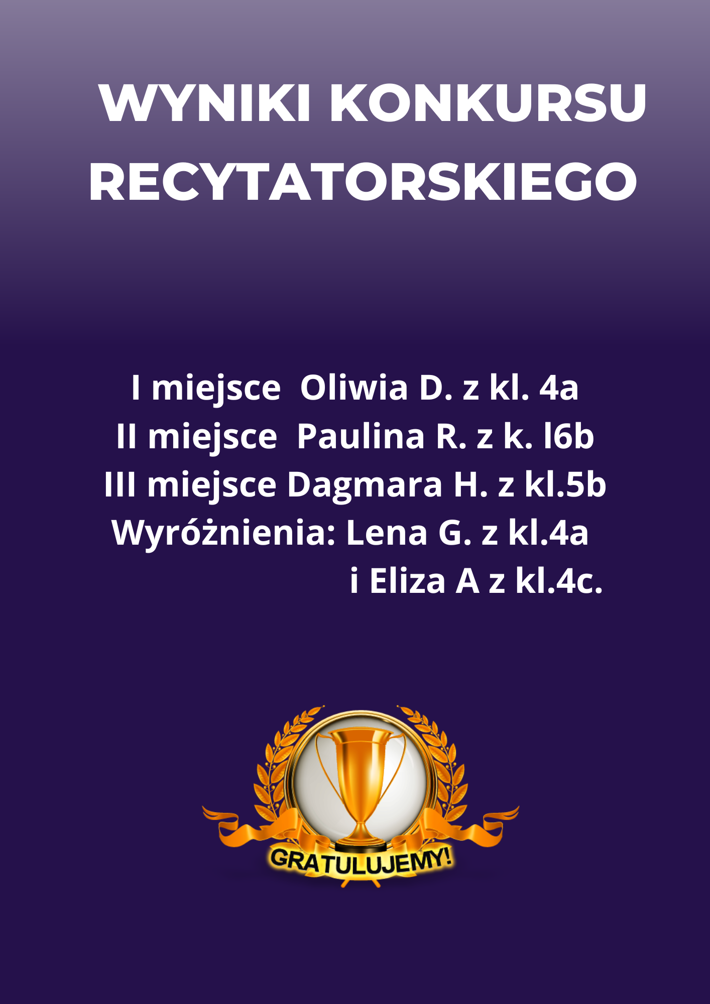 W konkursie wzięło udział 14 uczniów z klas IV – VIII. Jury konkursowe oceniało: dobór repertuaru, jego pamięciowe opanowanie, rozumienie tekstu oraz ogólny wyraz artystyczny. Dyplomy i nagrody zostały ufundowane przez Radę Rodziców. Gratulujemy zwycięzcom i wszystkim uczniom biorącym udział w konkursie! L. Magiera, K. Morgała