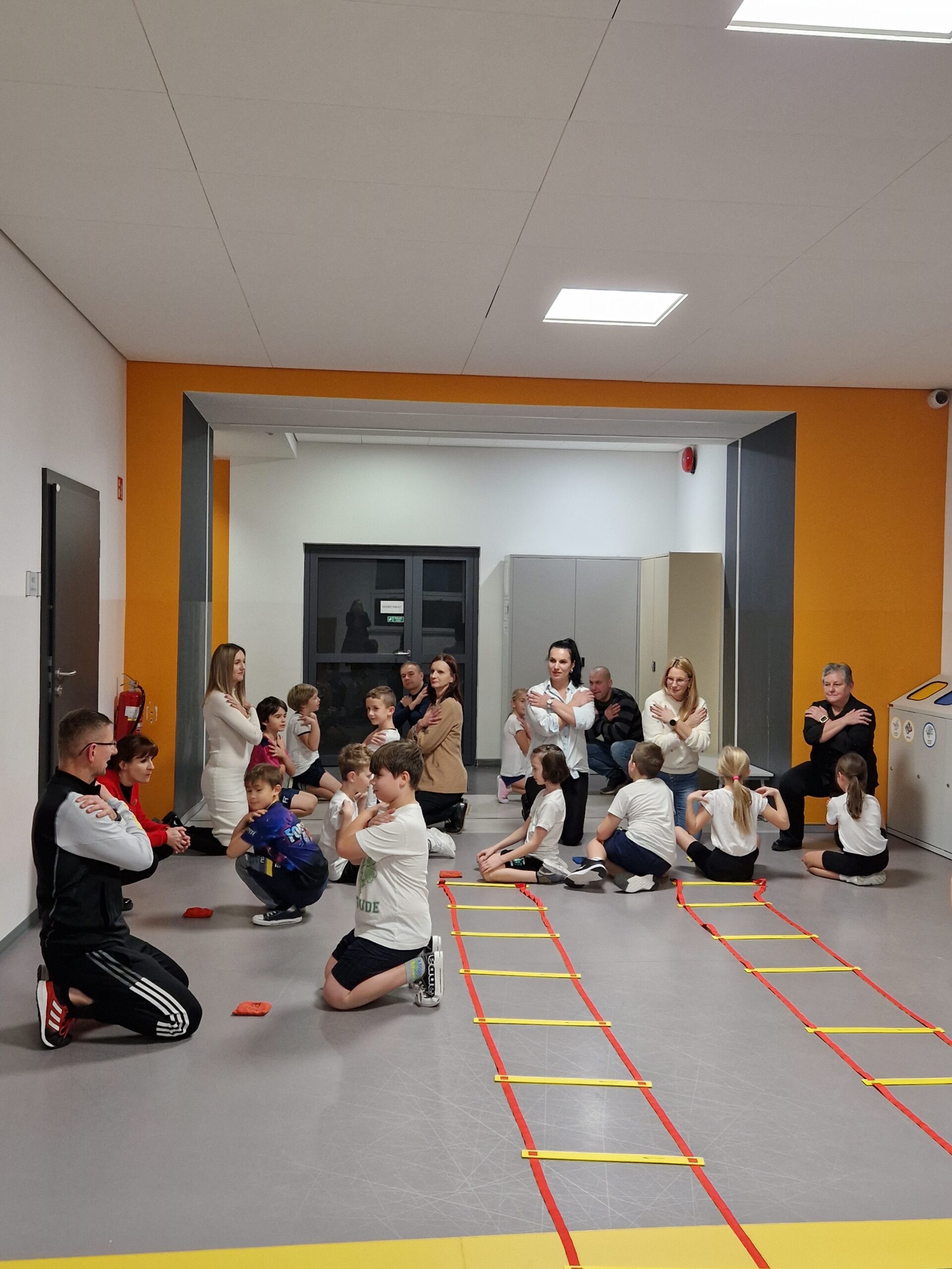 Na wywiadówkę z wychowania fizycznego zostali zaproszeni rodzice uczniów klasy 3b. Spotkanie, które przeprowadził pan Mariusz Ilmak, miało na celu podkreślenie znaczenia aktywności fizycznej w profilaktyce nadwagi i otyłości u dzieci. Zorganizowano je w ramach Programu „Mały Mistrz”. Rodzice zostali również zapoznani z założeniami programu i sprawnościami, które uczniowie zdobywają podczas zajęć. W części praktycznej spotkania uczniowie pod okiem pana Mariusza zaprezentowali gry, zabawy i ćwiczenia mające pozytywny wpływ na rozwój ruchowy. Do ćwiczeń i zabawy włączyli się również rodzice. Uczestnicy spotkania doświadczyli, jak przez zabawę można aktywnie spędzić czas i motywować do aktywności fizycznej. Podczas zajęć wykorzystano piłki, drabinki koordynacyjne, materace i woreczki gimnastyczne. Sportową wywiadówkę zakończono muzycznie. Dzieci zagrały rodzicom ludową melodię na dzwonkach i zaśpiewały z akompaniamentem instrumentów perkusyjnych „Deszczową piosenkę”.