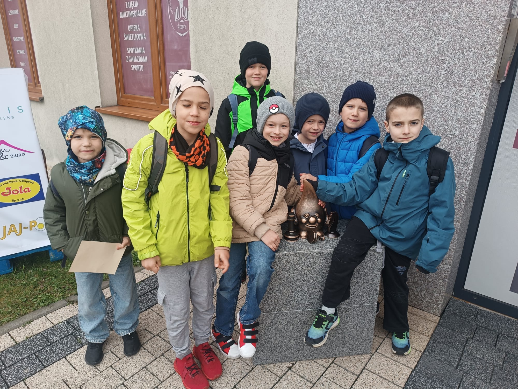 Na zdjęciu: uczniowie naszej szkoły z nowoodsłoniętą figurą Żorka-Szachisty przy Niepublicznej Szkole Mistrzostwa Sportowego w Żorach