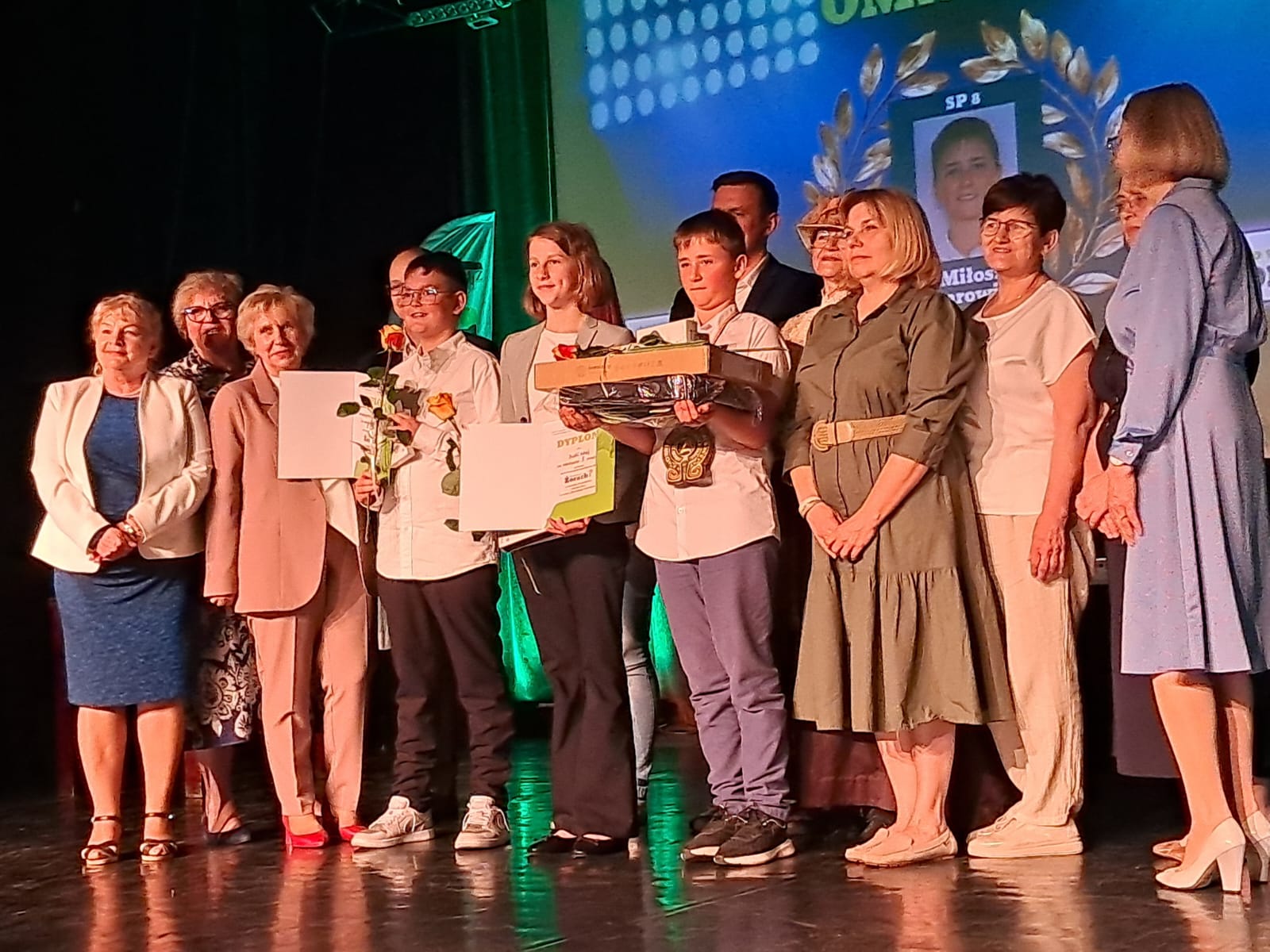 Na zdjęciu: uczeń naszej szkoły -Miłosz S. z otrzymaną nagrodą za zwycięstwo w konkursie Omnibus wraz z innymi laureatami oraz organizatorami konkursu