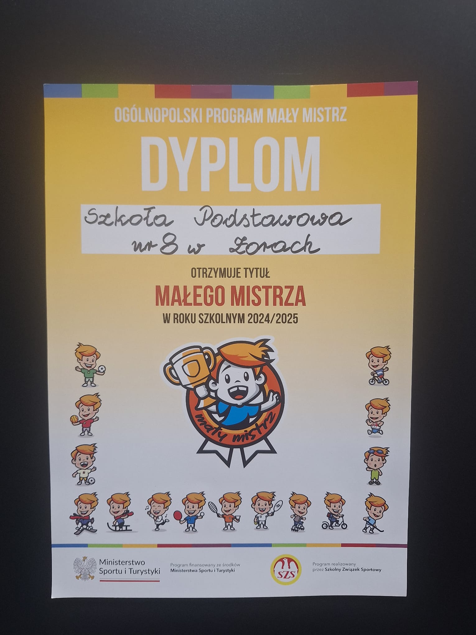 Na zdjęciu dyplom od SZS dla SP 8 Żory za udział w programie Mały Mistrz.
