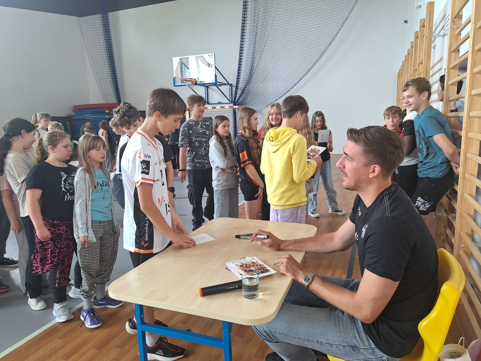 Na zdjęciu: Wicemistrz świata w siatkówce podpisujący autografy uczniom naszej szkoły