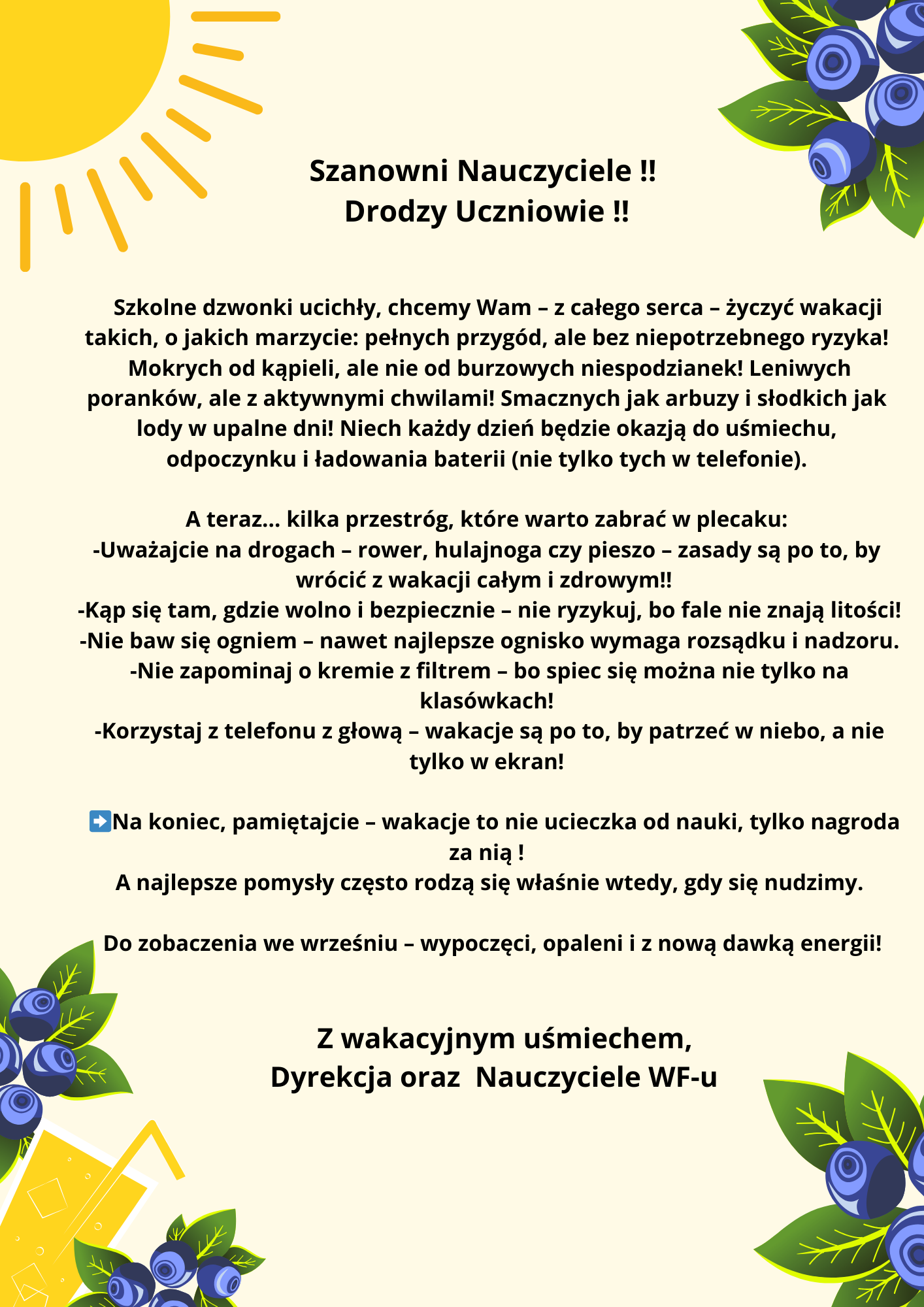 Bezpiecznych wakacji na sportowo życzą n-le WF-u.