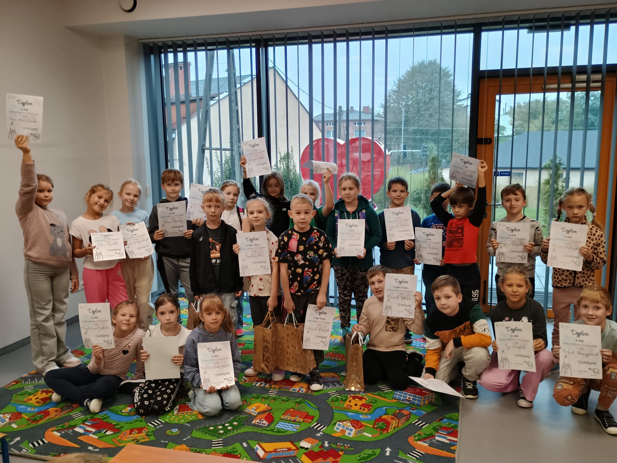 Na zdjęciu: uczestnicy konkursu plastycznego „Zoo Jana Brzechwy” z otrzymanymi dyplomami i nagrodami