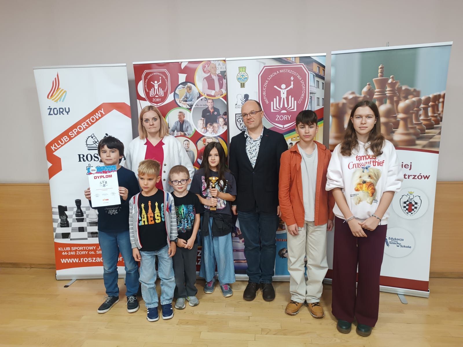 W dniu dzisiejszym 4 świetnych szachistów z naszej szkoły w składzie Leon K. z 4b, Piotr H. z 2d, Jerzy K. z 1b oraz Wiktoria P. z 2c reprezentowali naszą szkołę w Drużynowych Igrzyskach Dzieci w Szachach. Nasi uczniowie zagrali świetnie, pokonując 7 innych szkół, w których składach często grali starsi uczniowie (był to turniej dla klas 1-6!), co tym bardziej zasługuje na wielką pochwałę ich umiejętności, ale też opanowania i skupienia! Zdobyli tym samym puchar za III miejsce!