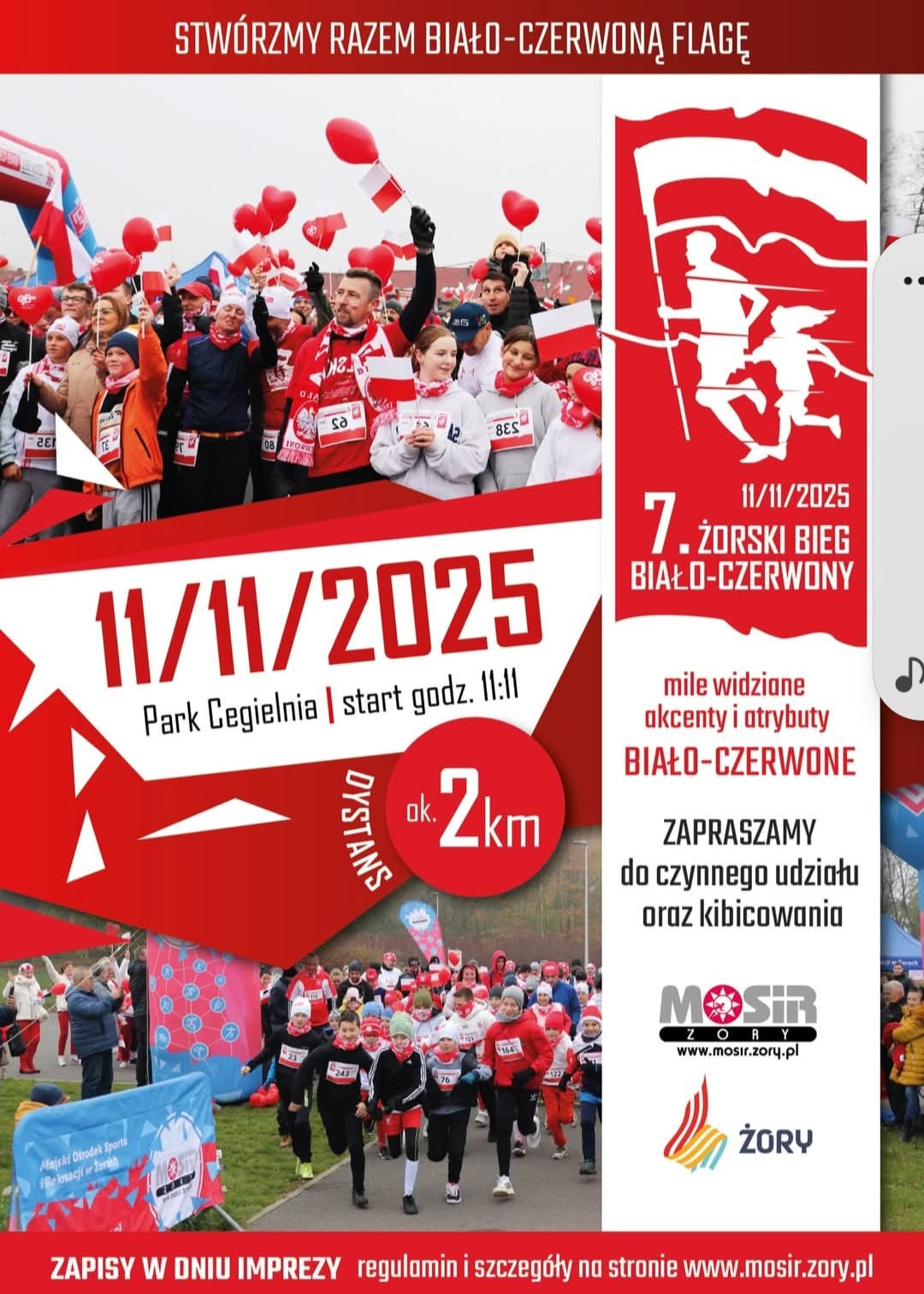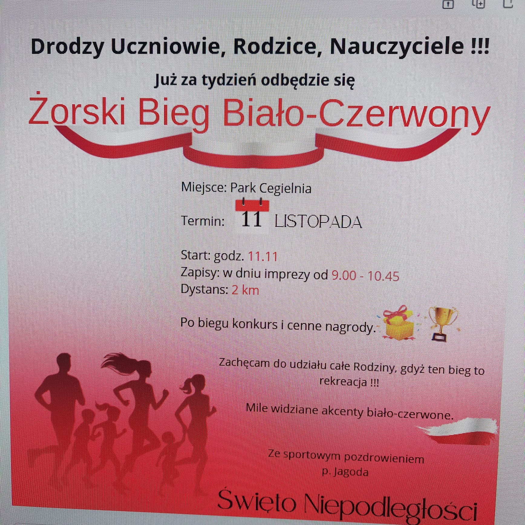 Drodzy Rodzice, Uczniowie, Nauczyciele i Mieszkańcy Rogoźnej‼️ Już niebawem odbędzie się Żorski Bieg Biało-Czerwony – wyjątkowe sportowe święto, które łączy pokolenia i przypomina, że wspólne bieganie to nie tylko rywalizacja, ale przede wszystkim radość, wspólnota i duma z barw narodowych‼️ W ubiegłym roku nasza szkolna drużyna z Rogoźnej liczyła aż 1️⃣0️⃣0️⃣ uczestników‼️ To było coś niesamowitego – dzieci, rodzice, nauczyciele i przyjaciele szkoły razem na jednej trasie‼️
