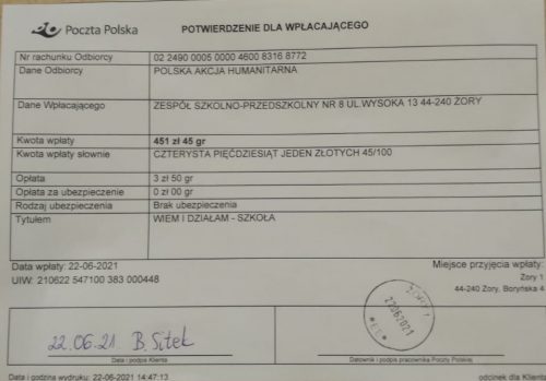 zakończona. Zebraliśmy 451 złotych i 45 groszy , pieniądze zostały wysłane na konto fundacji – Polska Akcja Humanitarna. DZIĘKUJEMY!!!!