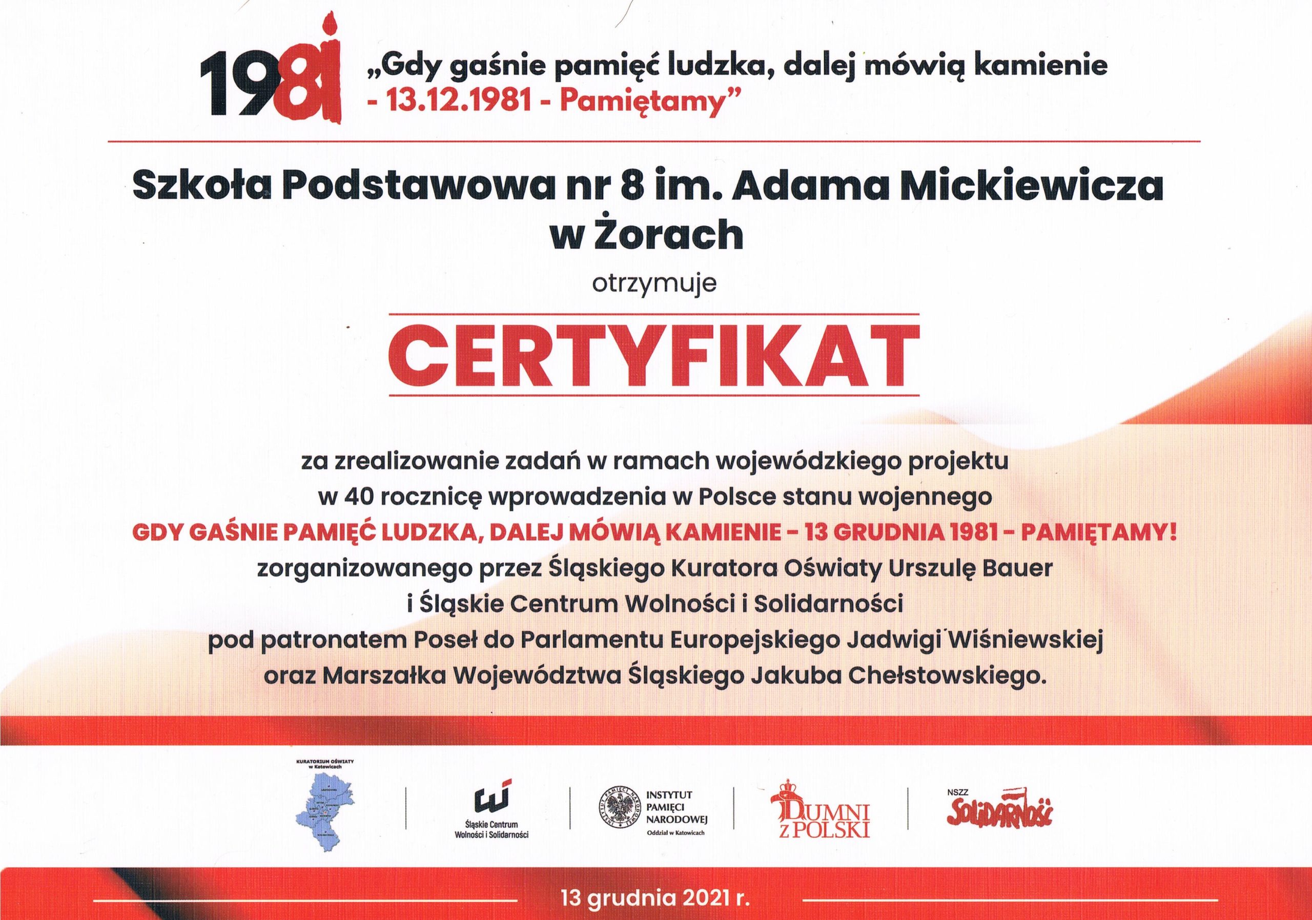Posted on 21 czerwca 2022 by szkola8zory Posted in Bez kategorii Z radością informujemy, że Nasza Szkoła otrzymała certyfikat za zrealizowanie zadań w ramach wojewódzkiego projektu w 40. rocznicę wprowadzenia w Polsce Stanu Wojennego „Gdy gaśnie pamięć ludzka, dalej mówią kamienie – 13. grudnia 1981 – PAMIĘTAMY”.