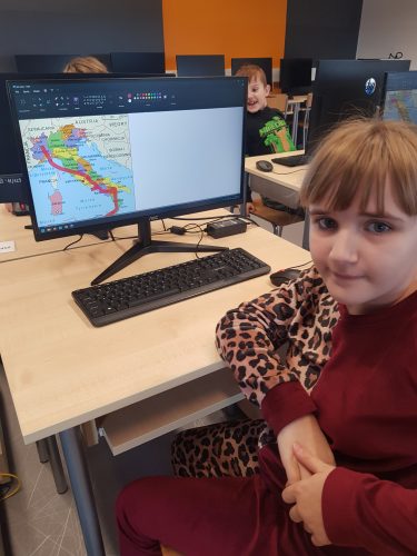 Uczniowie z klasy 3c zakończyli i podsumowali II moduł projektu „Czytam z klasą lekturki spod chmurki”. Podczas realizacji modułu wspólnie wybraliśmy i przeczytaliśmy lekturę „O psie który jeździł koleją” . Uzupełniliśmy nasze lekturniki i zaprojektowaliśmy pomysłowe obroże dla głównego bohatera książki. Podczas omawiania lektury w programie graficznym „Paint” uczniowie na mapie Włoch zaznaczali całą trasę, którą przebył główny bohater oraz z masy solnej ulepiliśmy figurę psa Lampo. Wykonaliśmy w grupach ilustracje do najciekawszych fragmentów książki. Na koniec, aby utrwalić treść lektury rozwiązywaliśmy quizy on-line.