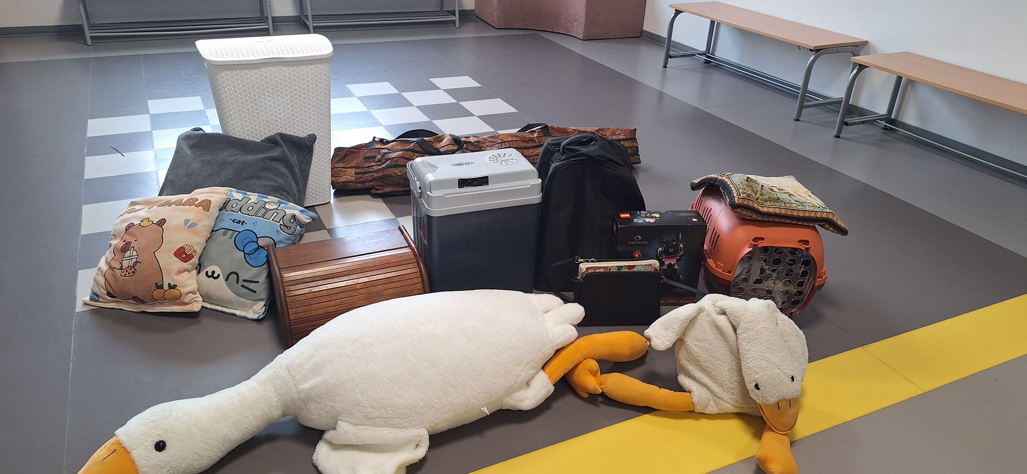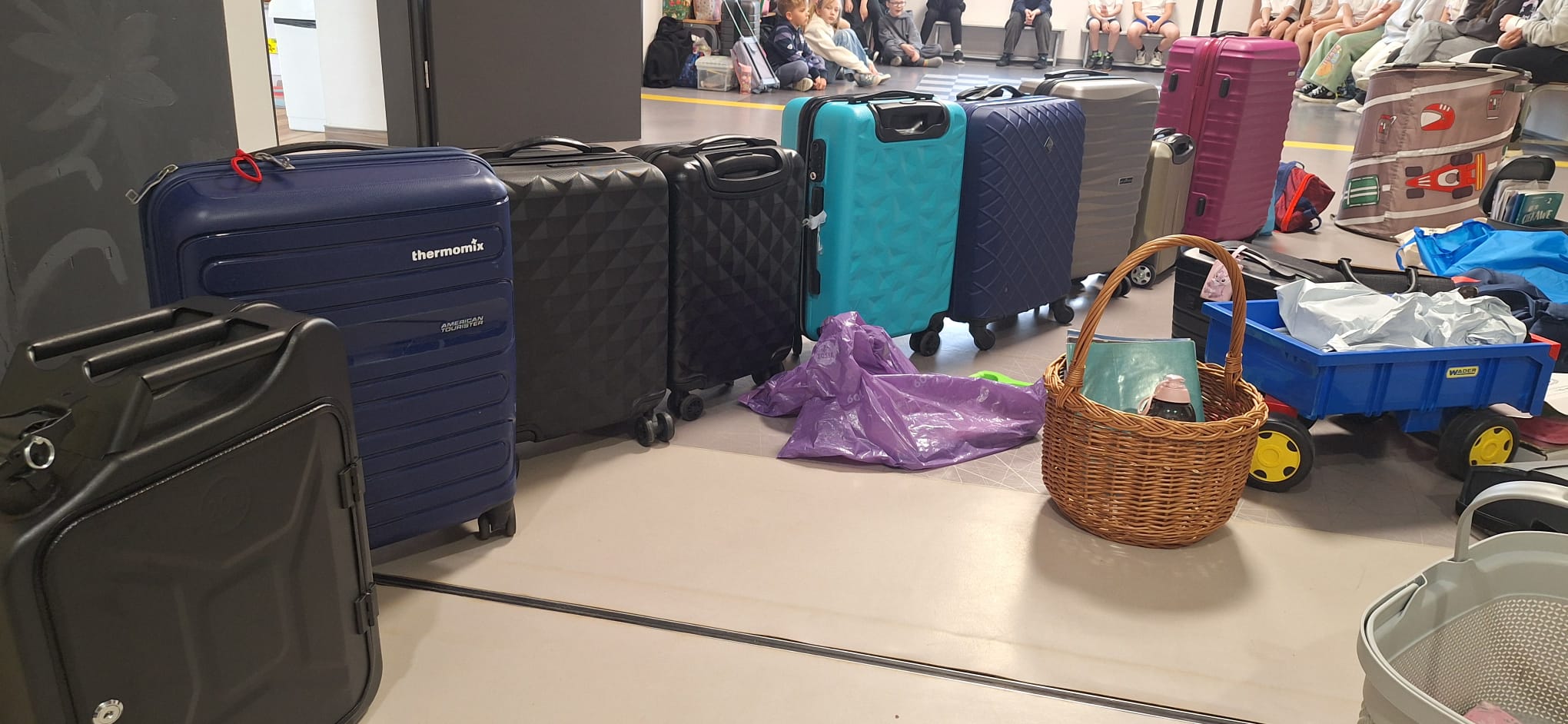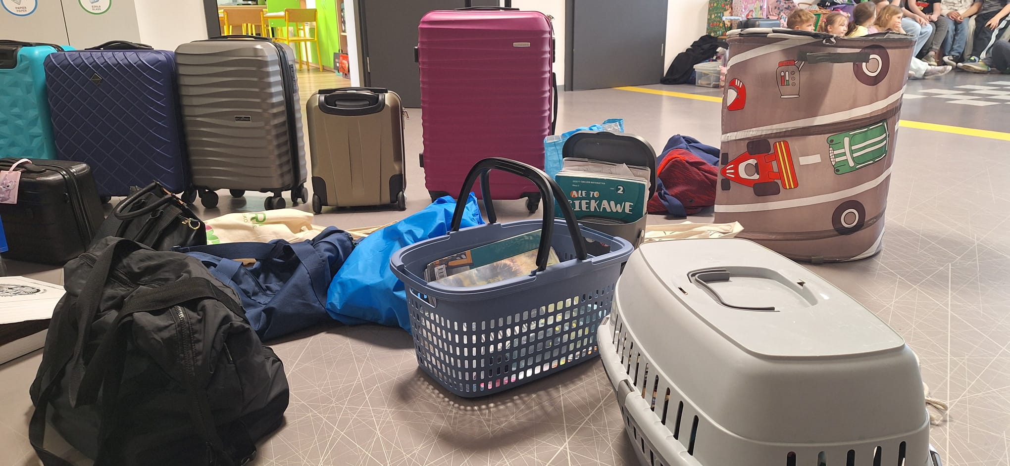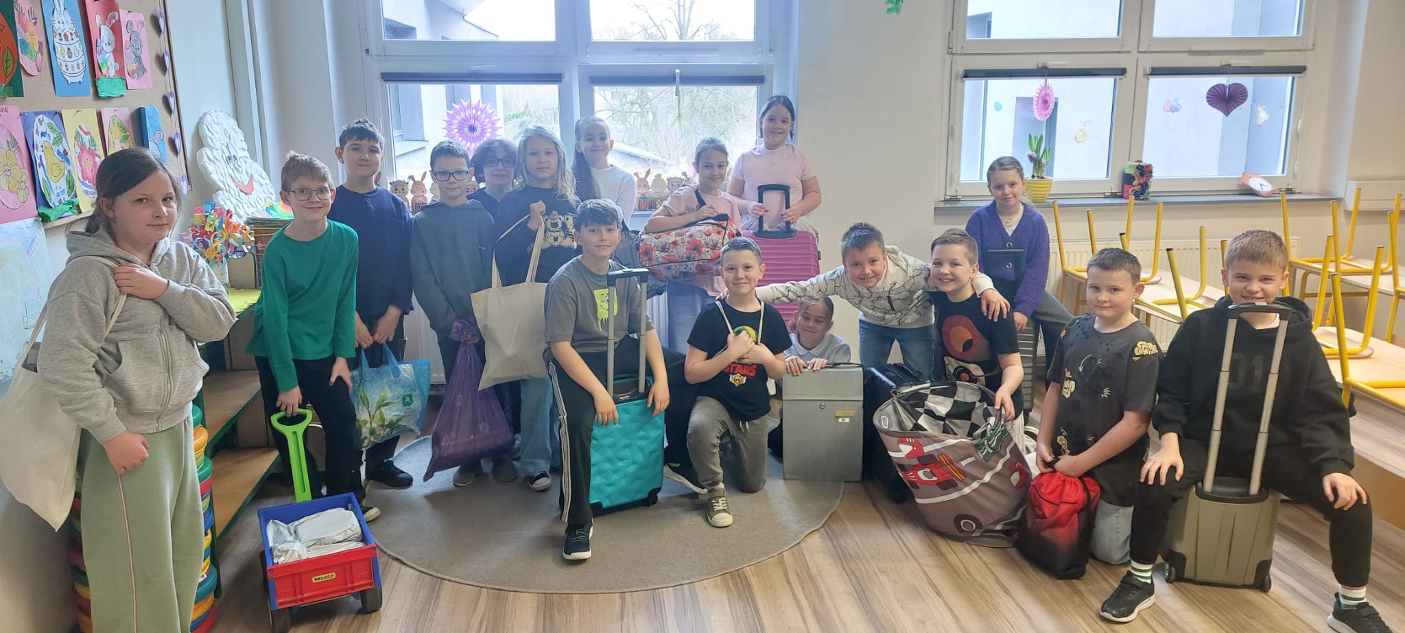 Na zdjęciach uczniowie oraz różne przedmioty, w których uczniowie przynieśli do szkoły podręczniki.