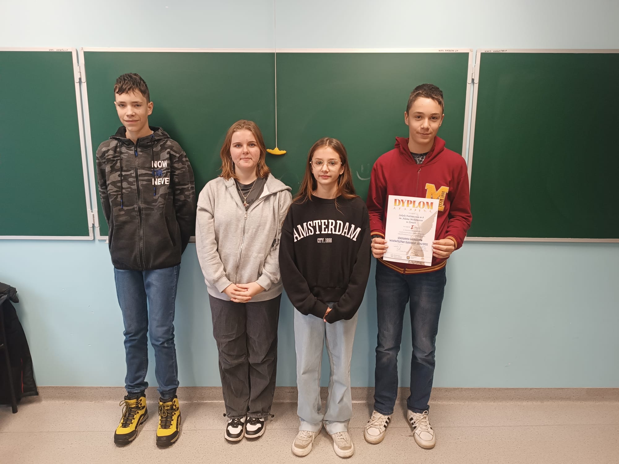 Za zdjęciu: zwycięska drużyna rejonowych zawodów szachowych Szkolnych Mistrzostw Województwa Śląskiego 2024/2025 wraz z otrzymanym dyplomem