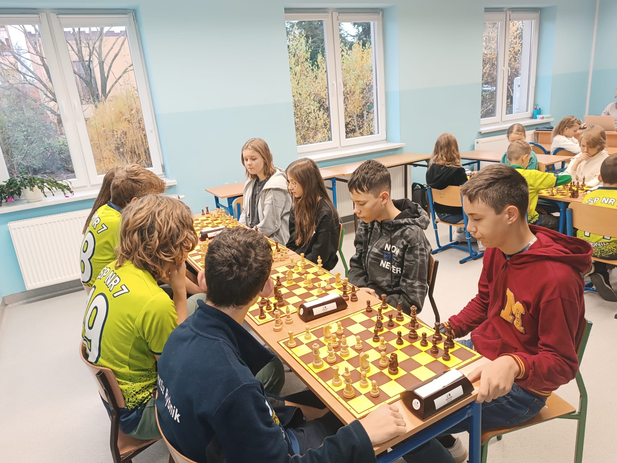 Dziś miały miejsce rejonowe rozgrywki szachowe z najlepszą szkolną drużyną szachistów z Rybnika, w których nasza drużyna szachistów z klas 7-8, a właściwie z klasy 7B zwyciężyła! Drużyna w składzie: Mikołaj P., Mateusz K., Nadia D. oraz Paulina R. pokazała świetną klasę swoich umiejętności i z wielkim spokojem, opanowaniem i skupieniem rozegrała 2 mecze, w których w jednym zwyciężyła, a w drugim zremisowała, co ostatecznie dało jej zwycięstwo . Teraz czeka naszych uczniów finałowy etap Szkolnych Mistrzostw Województwa Śląskiego, który odbędzie się już 26.11.2024 w Częstochowie. Serdecznie gratulujemy i już na zapas trzymamy kciuki za ich przyszły sukces!