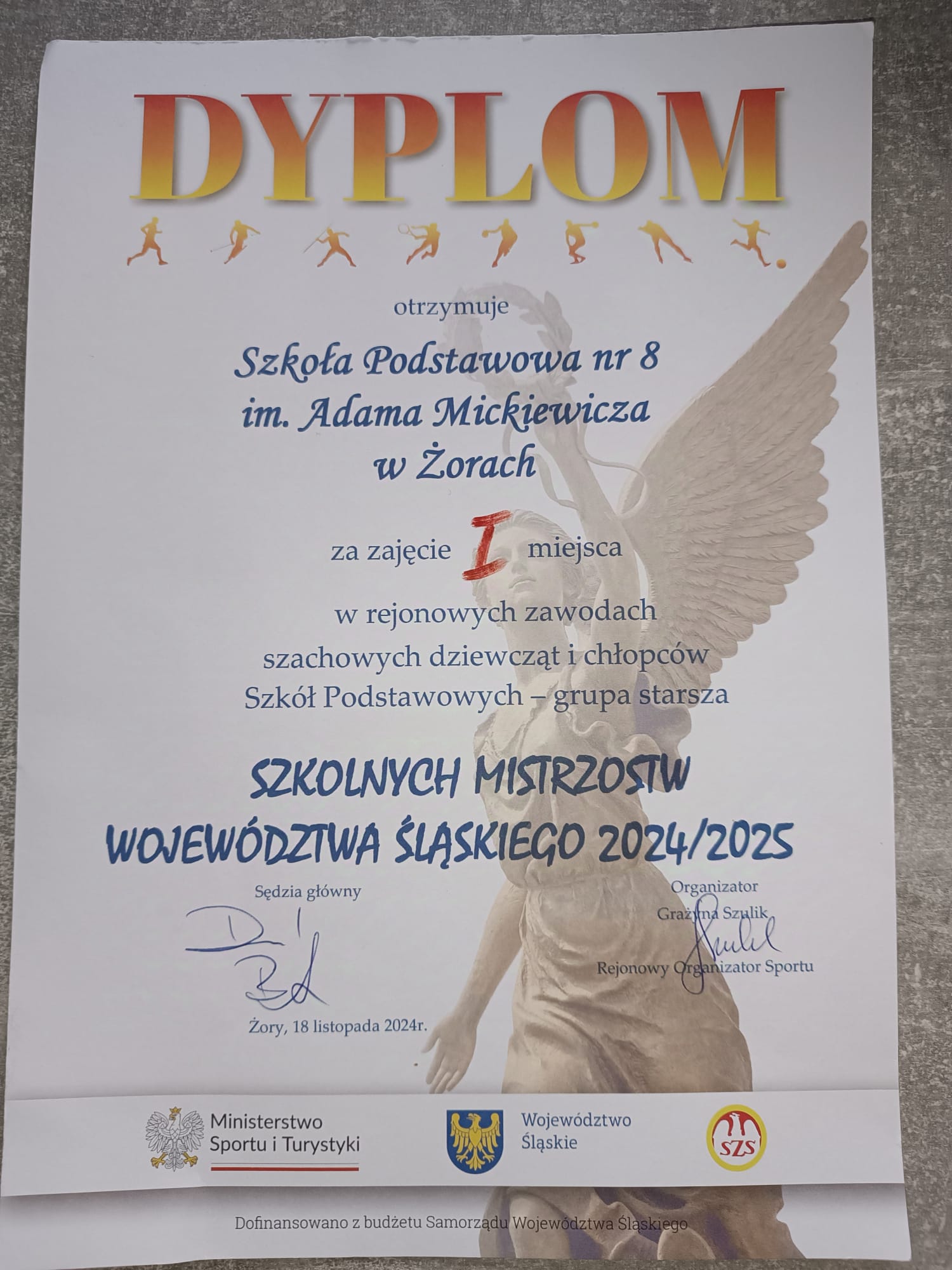 Na zdjęciach kolejno: uczniowie naszej szkoły grający przeciwko uczniom z Rybnika (dwa zdjęcia od lewej), następnie dyplom za zajęcie I miejsca w rozegranym turnieju