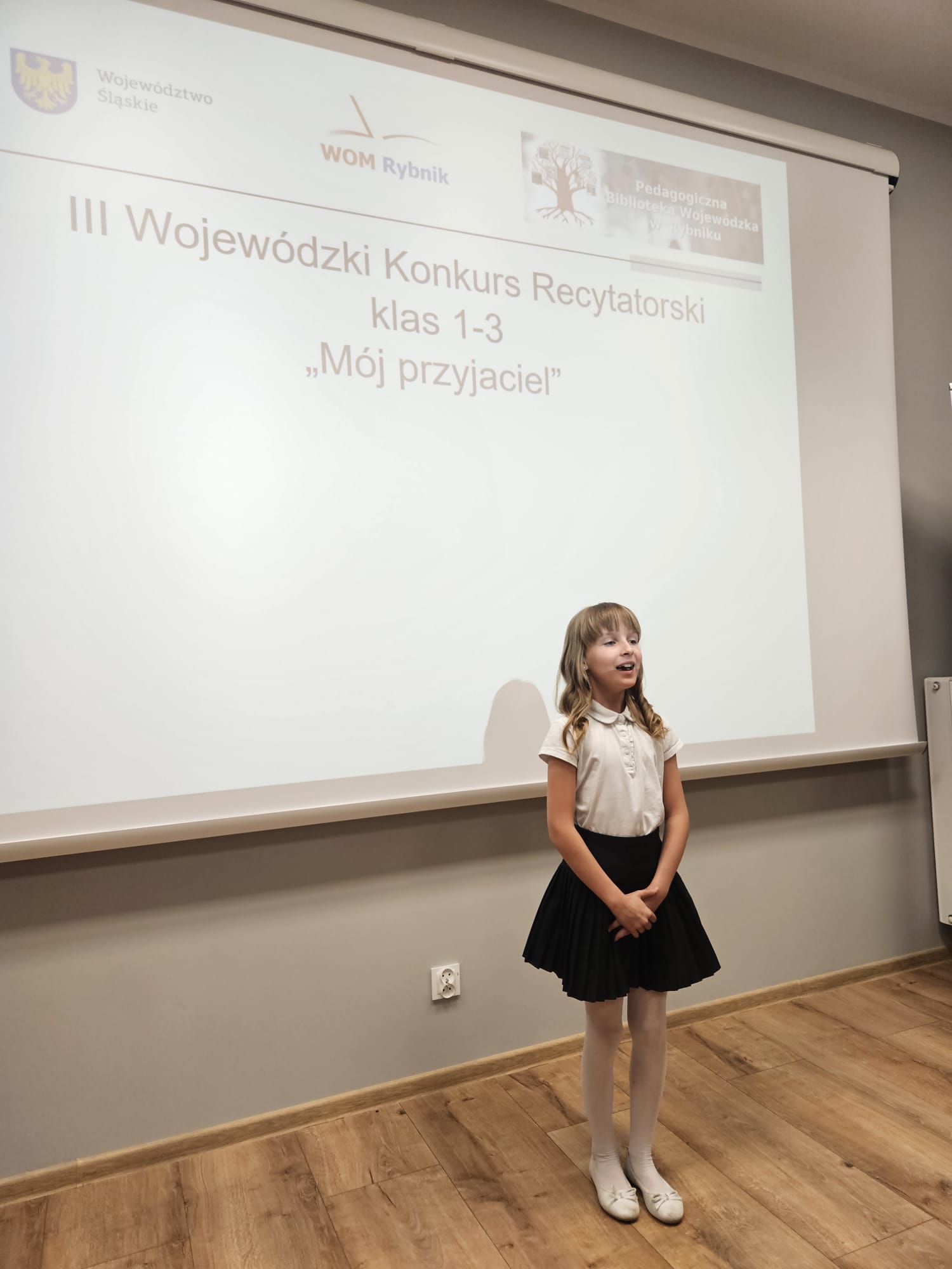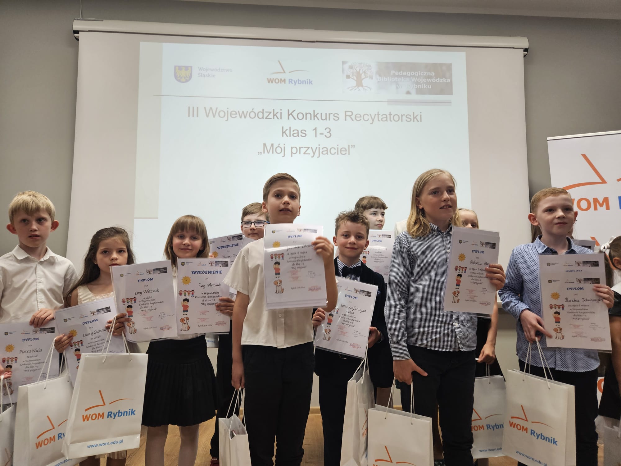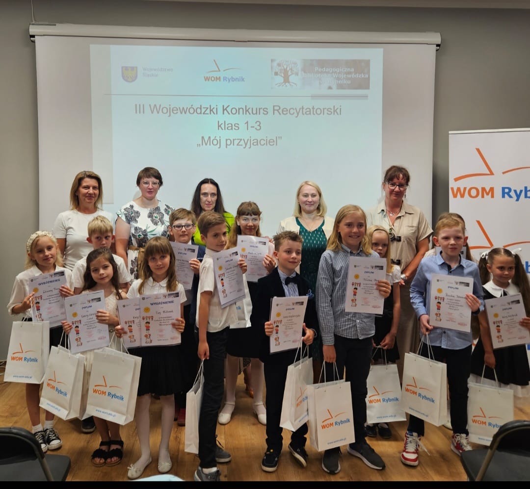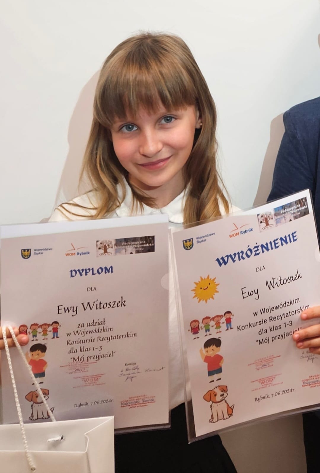 7 czerwca 2024r. w Rybniku odbył się III Wojewódzki Konkurs Recytatorski pod hasłem: „Mój Przyjaciel”. Do słownej rywalizacji stanęło trzynastu najlepszych recytatorów z powiatu żorskiego, wodzisławskiego, jastrzębskiego oraz rybnickiego. Naszą szkołę i zarazem małą ojczyznę- Żory reprezentowała Ewa Witoszek. Ewunia przepięknie wydeklamowała wiersz J.Brzechwy: „Prot i Filip”, czym zachwyciła jury i otrzymała wyróżnienie. Wielkie gratulacje dla wszystkich recytatorów i dla naszej Ewuni. Przebywanie wśród tak wspaniałych artystów było prawdziwą ucztą dla ciała i ducha. Marta Michalik