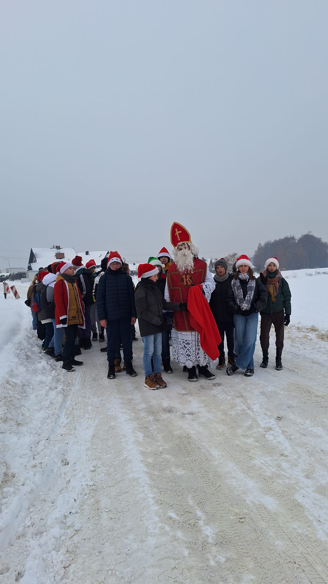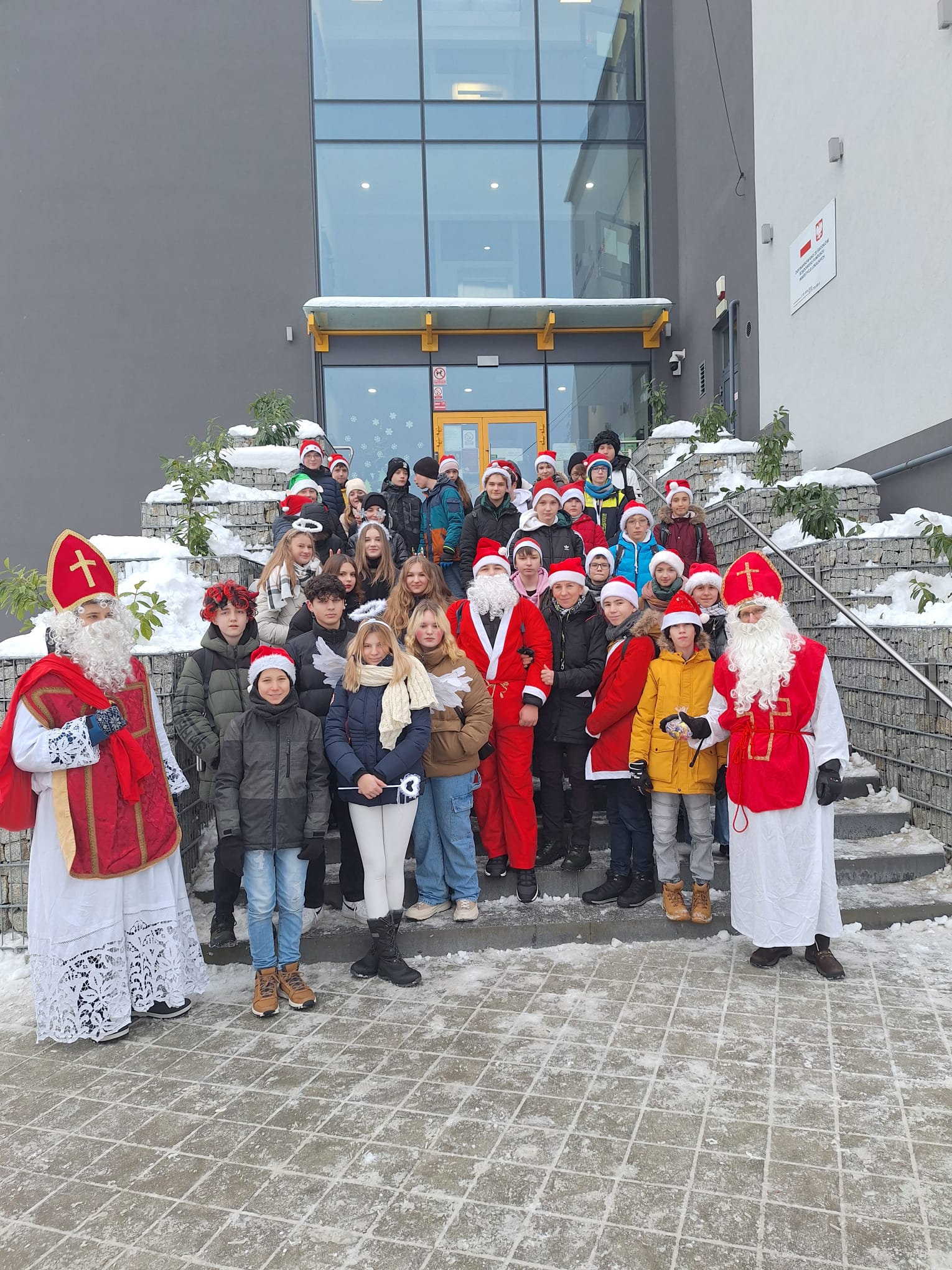 Na zdjęciach: Korowód Mikołajkowy złożony z uczniów naszej szkoły zmierzający do Kina Na Starówce