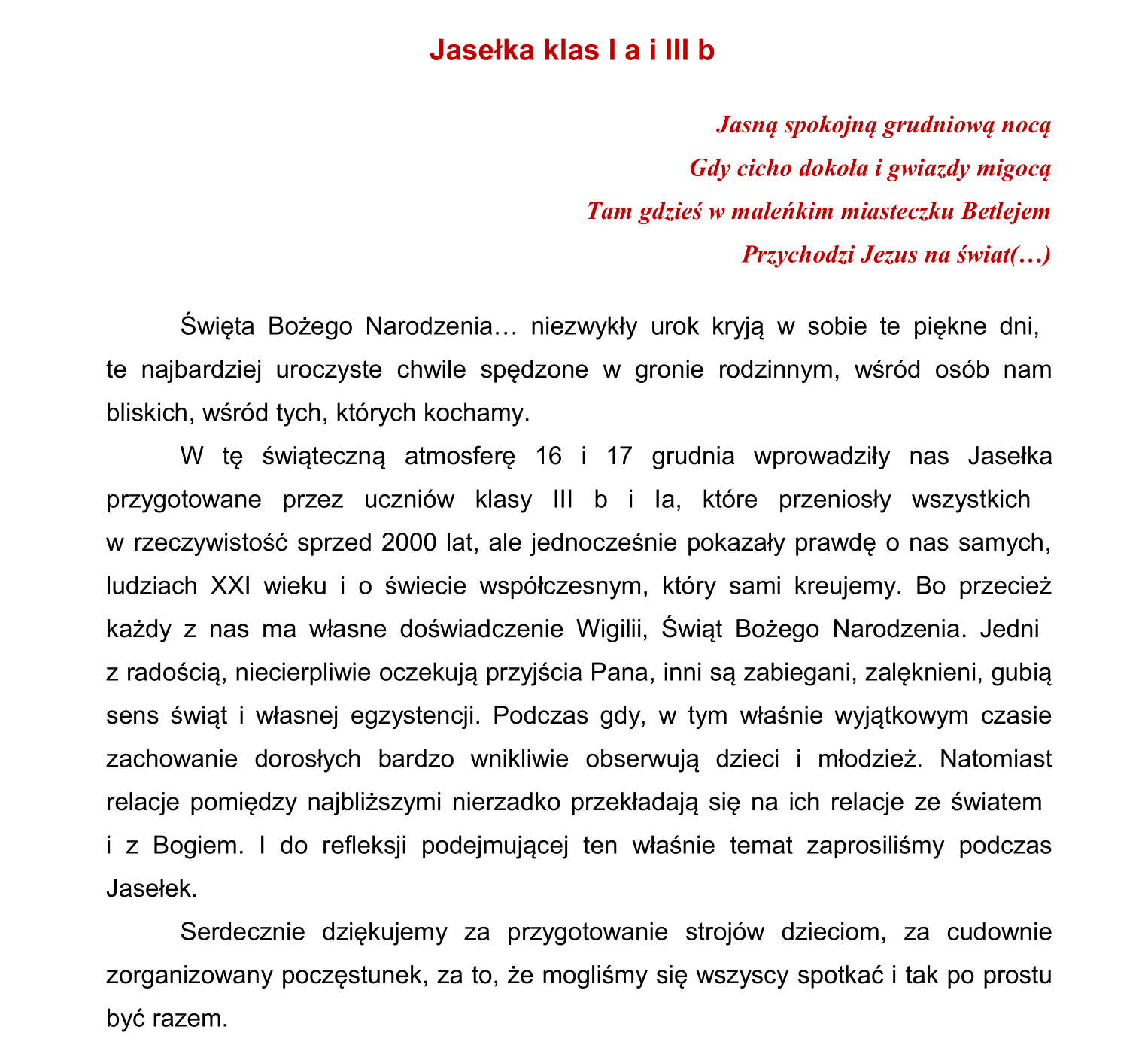 Posted on 23 grudnia 2021 by szkola8zory Posted in Bez kategorii ZAPRASZAMY DO WSPOMNIEŃ JASEŁKA KLASA 1A JASEŁKA KLASA 3B M. Michalik, M. Przybyło