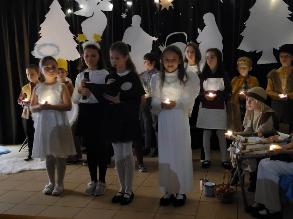 Ciszę betlejemskiej Nocy i radość Narodzin przeżywaliśmy ponownie w środę 21 grudnia  br.  za przyczyną uczniów klasy II a, którzy wcielili się w postacie biblijne, wystawiając wyjątkowe przedstawienie artystyczno-wokalne. Przedstawienie, które emanowało spokojem i pokojem, bo takie było jego założenie, wprowadzało widzów w stan autentycznego przeżywania. Ciepłe, prosto z serc płynące teksty z dziecięcą wrażliwością składały hołd Małemu Jezusowi.  Mali aktorzy zaprezentowali tradycyjną historię narodzin Jezusa Chrystusa. Uczniowie przygotowywali się z wielkim zaangażowaniem, pamiętając o powadze wydarzenia, jakim było przyjście na świat Zbawiciela. Stroje, muzyka, a przede wszystkim gra aktorska sprawiły, że nasze serca wypełniła radość, która wprowadziła wszystkich w świąteczny klimat. Ukazane zostały odwieczne wartości takie jak: miłość, życzliwość, nadzieja. Zawarte w programie treści religijne przeplatane kolędami oraz pastorałkami  wytworzyły niepowtarzalny nastrój Wzruszeni rodzice mogli zachwycić się publicznym występem swoich pociech.