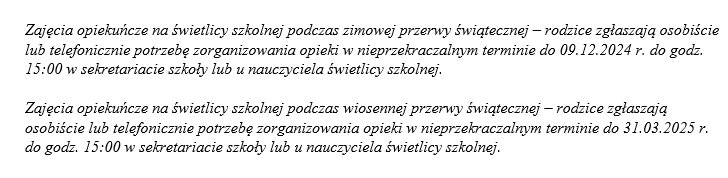 Opieka świetlicowa w dni wolne od zajęć dydaktycznych zapewniona jest w godzinach od 7:00 do 15:00