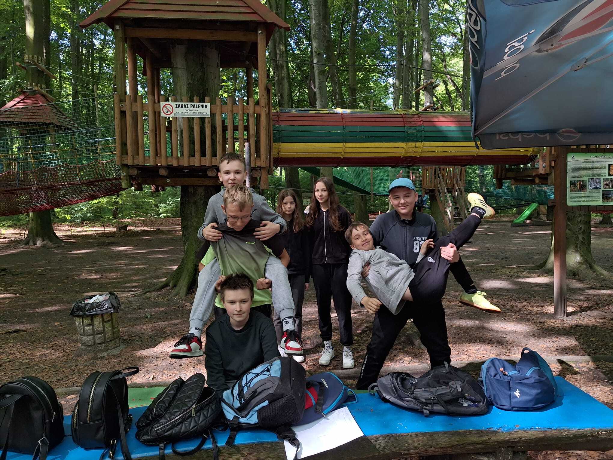 Na zdjęciach znajdują się uczniowie klas 6. w parku linowym