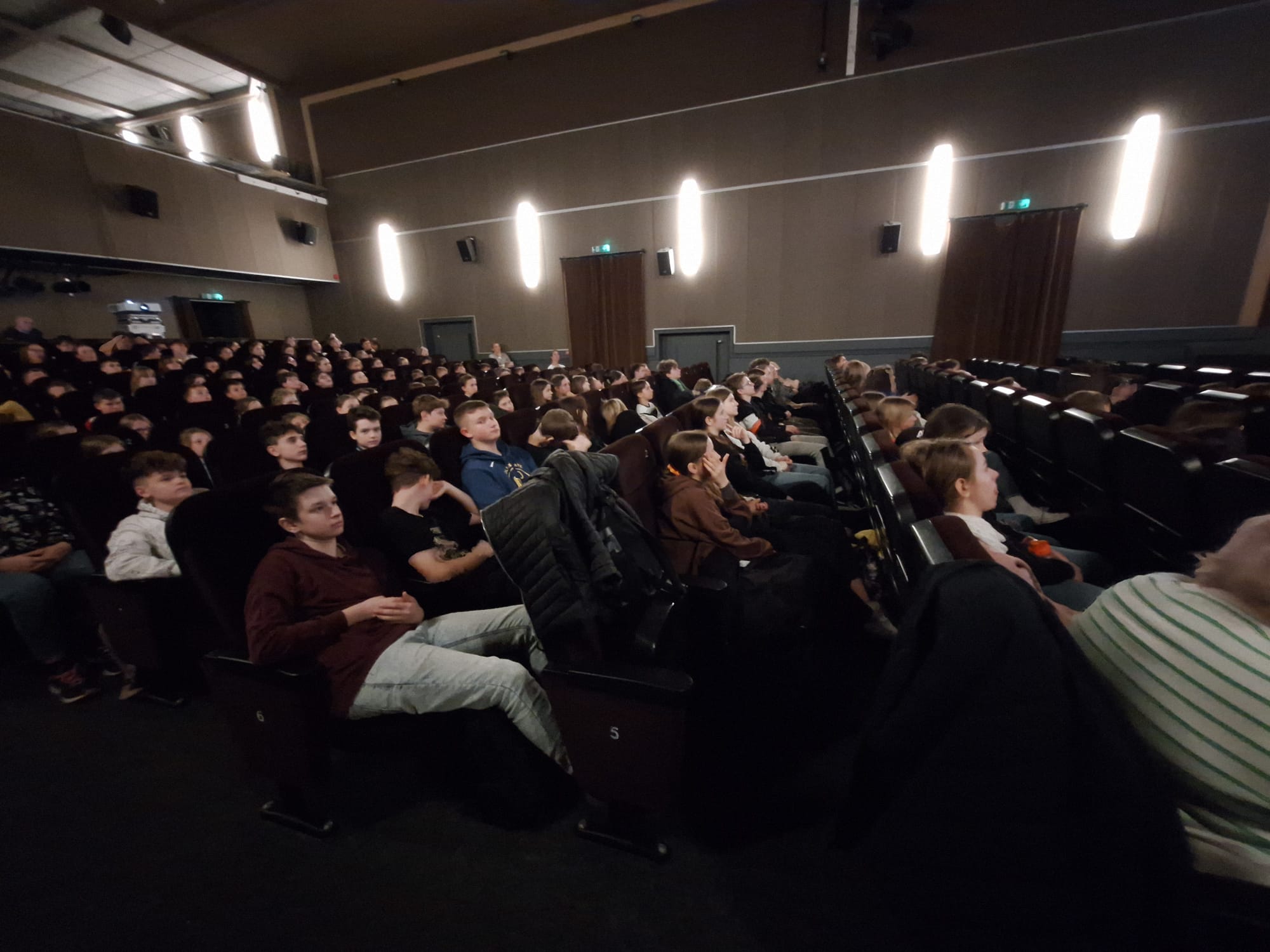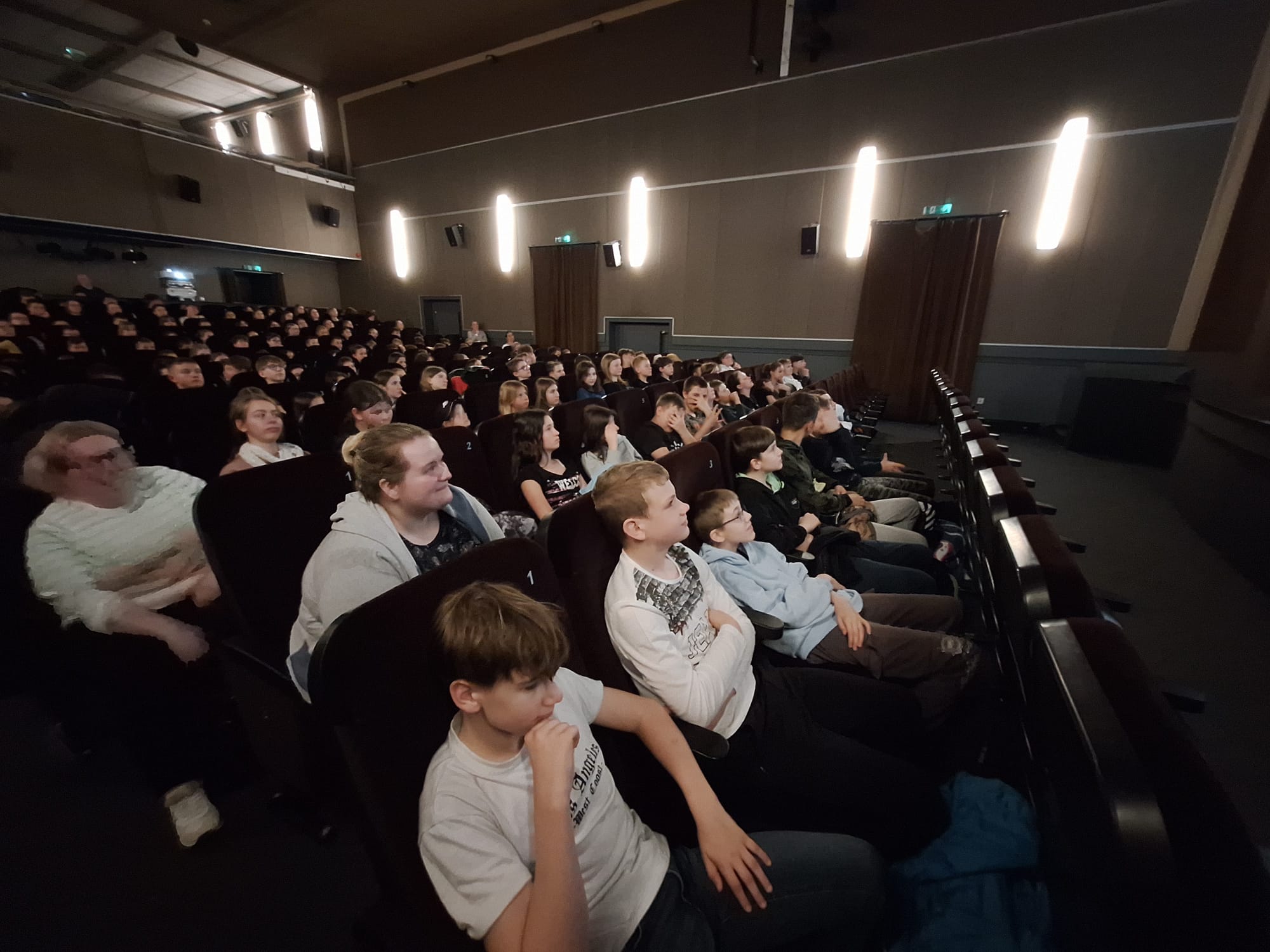 Na zdjęciu: uczniowie klas 6 i 7, biorący udział w lekcji w kinie
