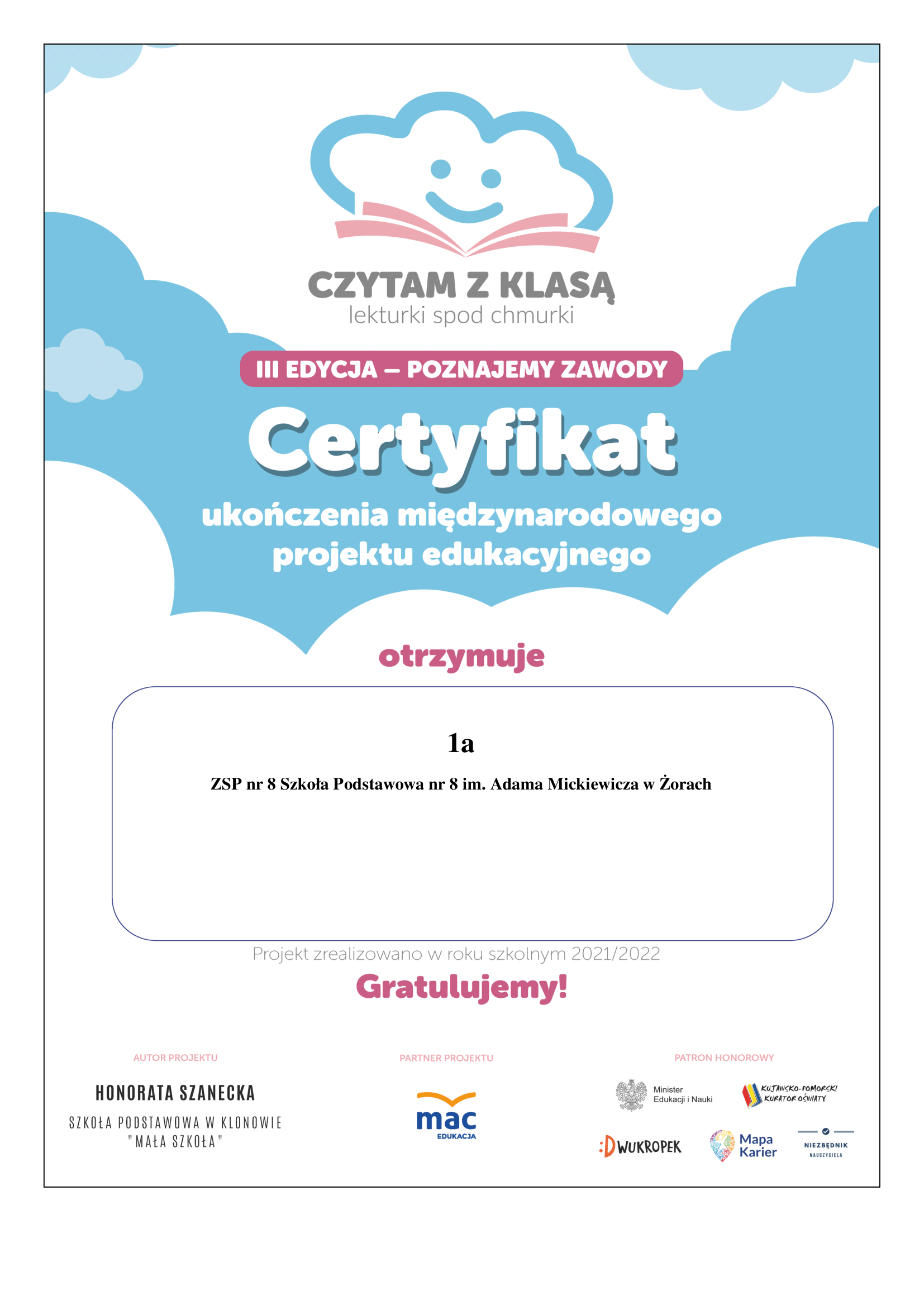 Lekturki spod Chmurki w klasie 1a i 3b – zakończenie projektu