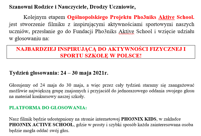 Posted on 21 maja 2021 by szkola8zory Posted in Bez kategorii LINK DO PLATFORMY, NA KTÓREJ OD PONIEDZIAŁKU ROZPOCZNIE SIĘ GŁOSOWANIE: https://pho3nix-kids.com/pho3nix-active-school/
