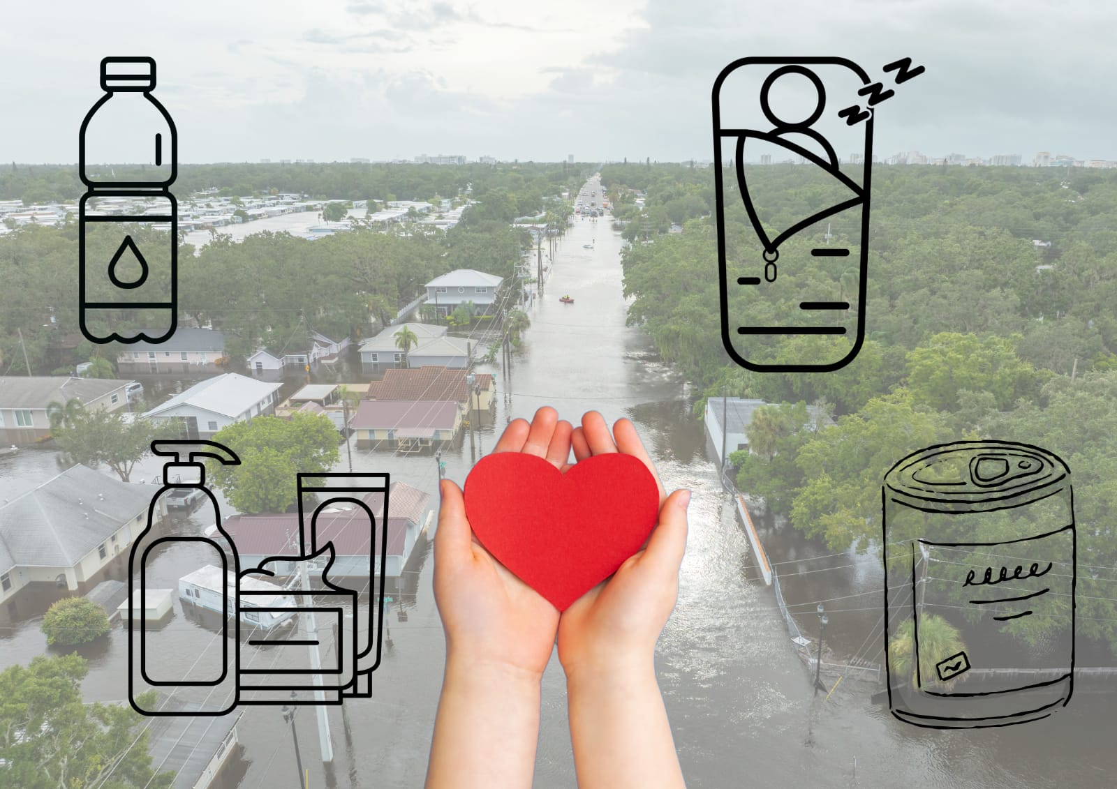 Na zdjęciu: grafika przedstawiająca dłonie trzymające serce na tle powodzi oraz graficzne elementy – produkty potrzebne osobom dotkniętym powodzią