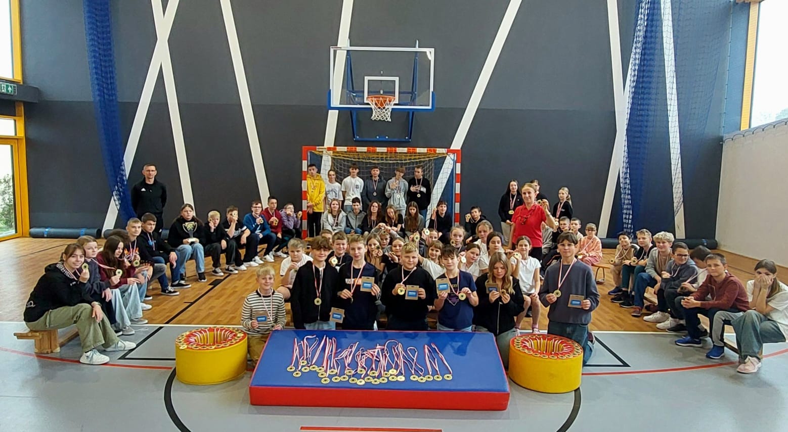 Na zdjęciu uczniowie SP-8 Żory, oraz nauczyciele: p. Jagoda B. i p. Mariusz I. którzy otrzymali medale za udział w akcji Rowerowa Stolica Polski. W sali gimnastycznej są również medale.