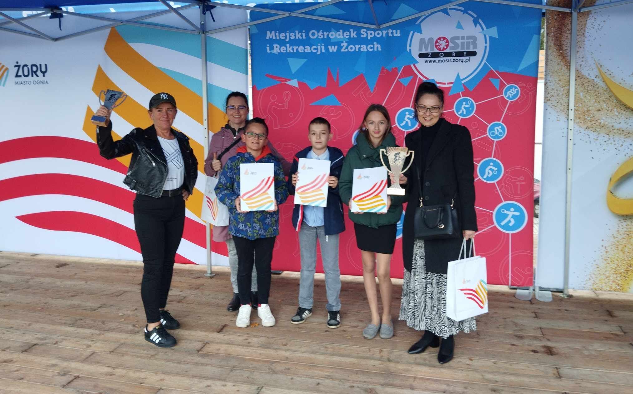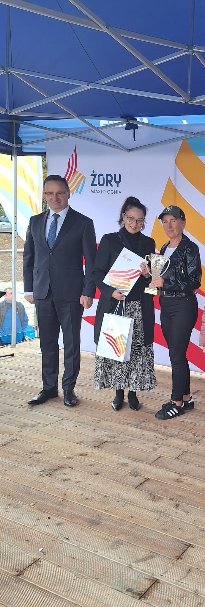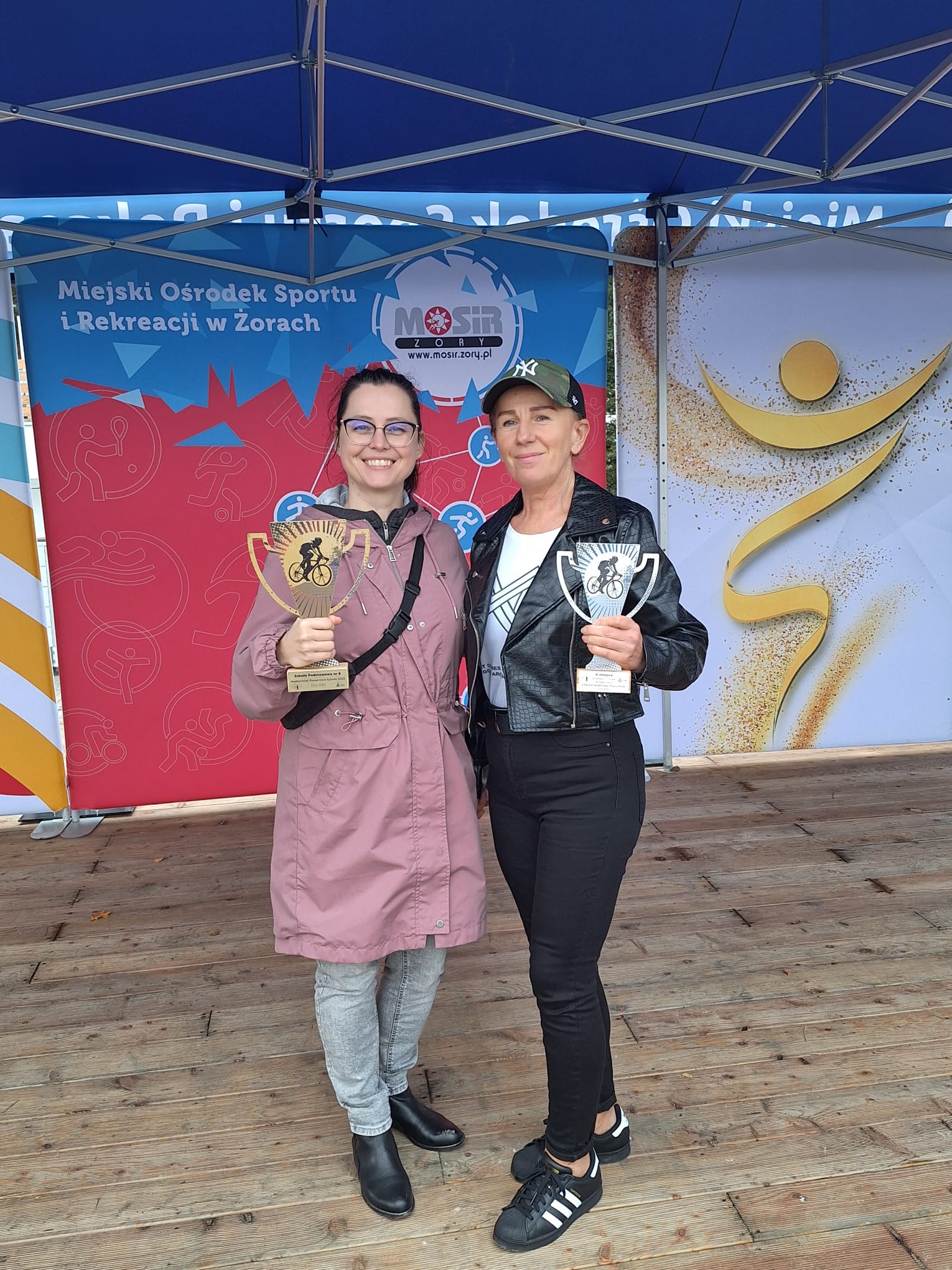 Na zdjęciach: z lewej – Pan Prezydent Miasta Żory Waldemar Socha wraz z Panią wicedyrektor Edytą Sitek oraz nauczycielką w ZPS8 i jednocześnie koordynatorką akcji „Rowerowej Stolicy Polski” w naszej szkole – Panią Jadwigą Błaszkowską-Domagała; na zdjęciu z prawej – nauczycielki Dominika Dastyk oraz Jadwiga Błaszkowska-Domagała trzymające zwycięskie statuetki