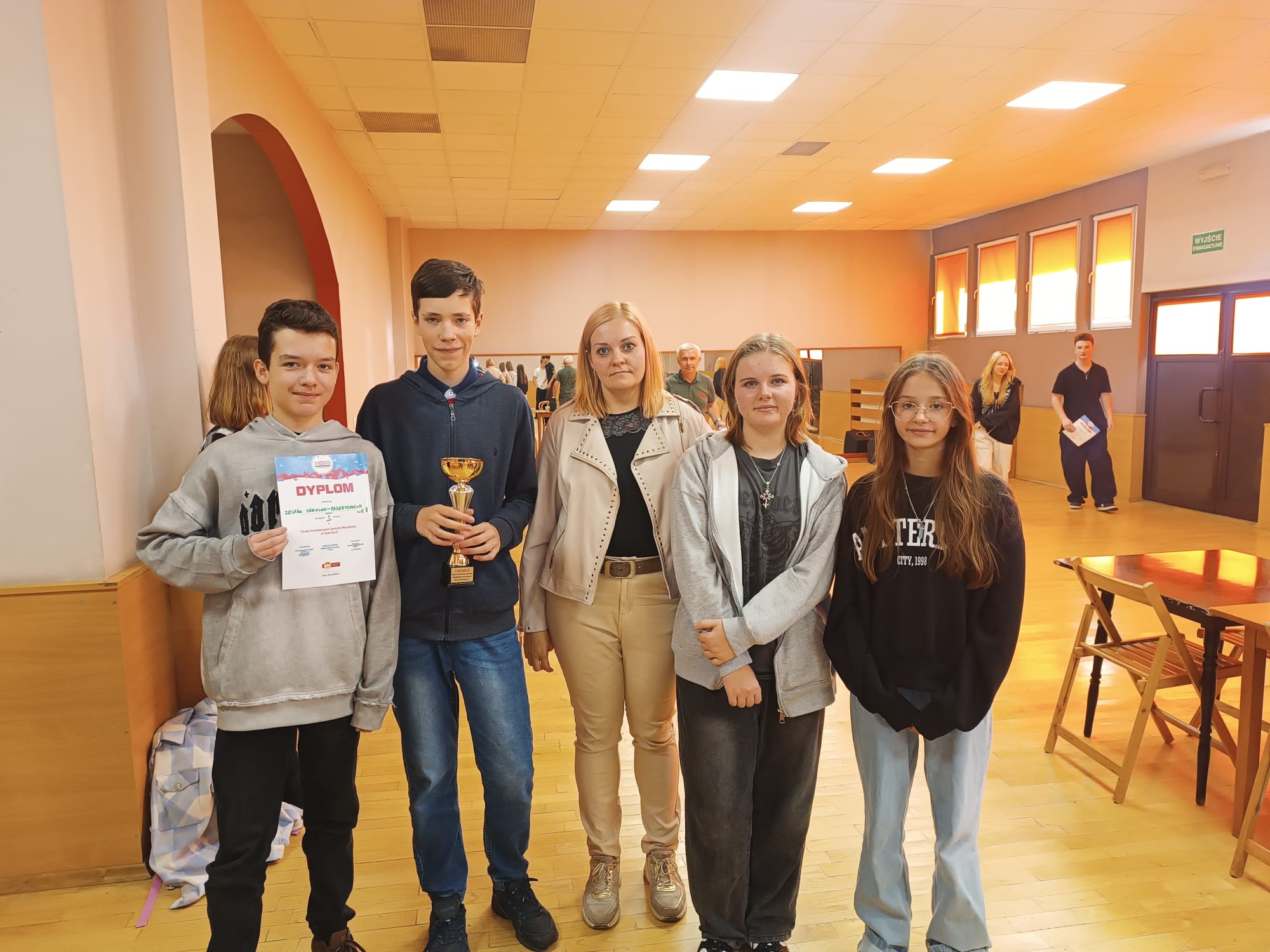 Na zdjęciu: Zwycięzcy Drużynowych Powiatowych Igrzysk Szachowych Młodzieży – Wojtek B., Mateusz K, Paulina R. oraz Nadia D. wraz z opiekunem – p. Marceliną Skoneczną, trzymający puchar i dyplom za zdobycie I miejsca