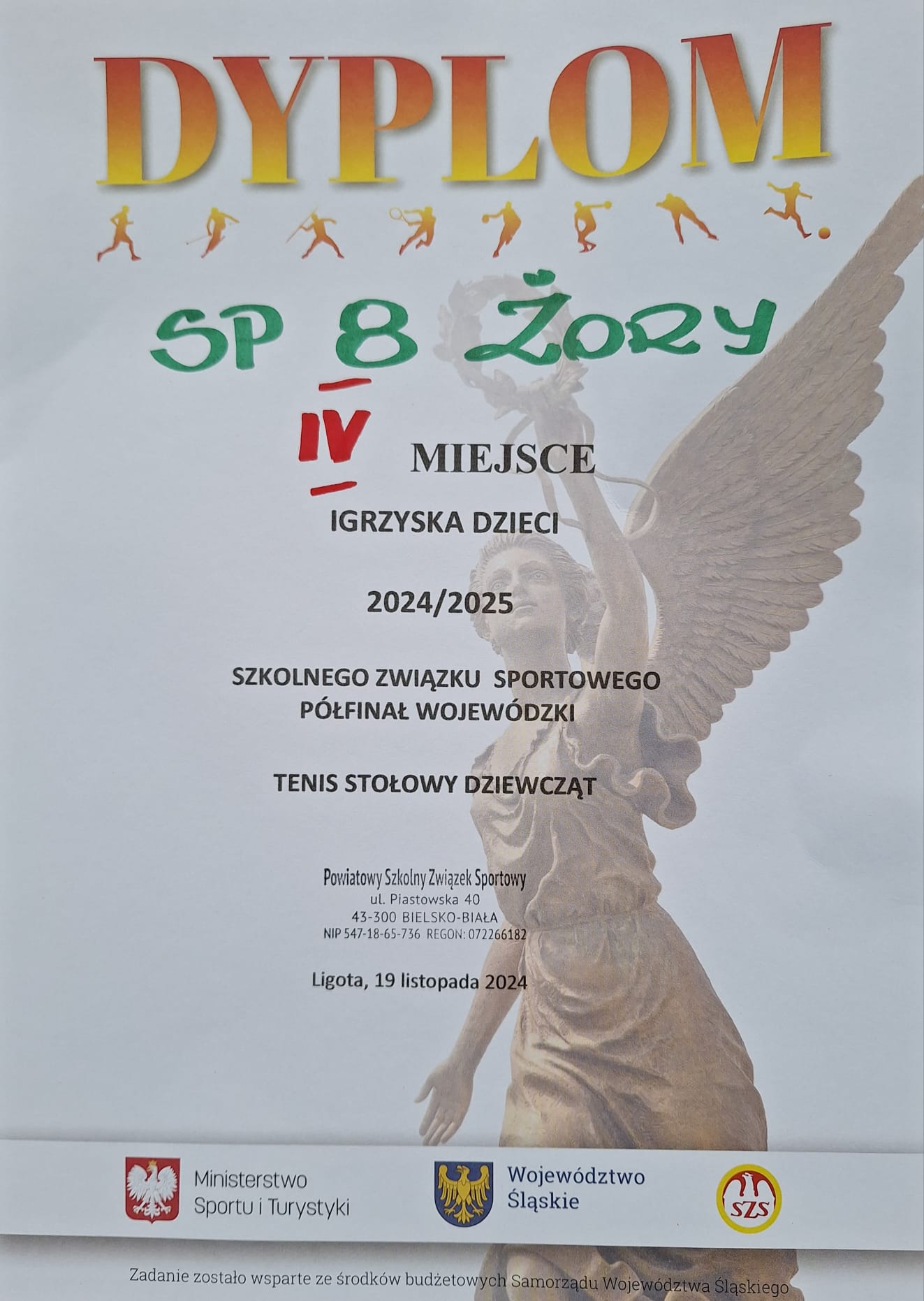 Na zdjęciach od lewej: Dyplom SZS dla uczennic SP 8 Żory za zdobycie 4 m- ca w wojewódzkim półfinale tenisa stołowego, następnie uczennice klasy 5c Natalia i Oliwia z dyplomem SZS dla SP 8 Żory za zdobycie 4 m- ca w wojewódzkim półfinale tenisa stołowego.