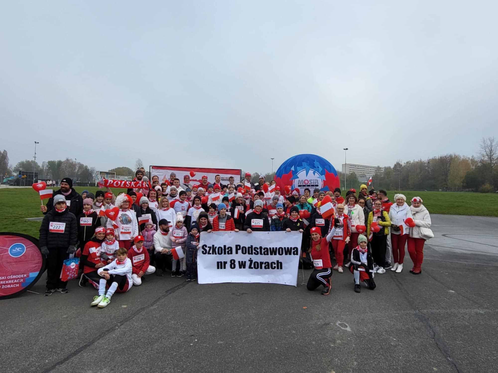 Na zdjęciu społeczność SP-8 Żory przed biegiem biało-czerwonym w Parku Cegielnia w Żorach.