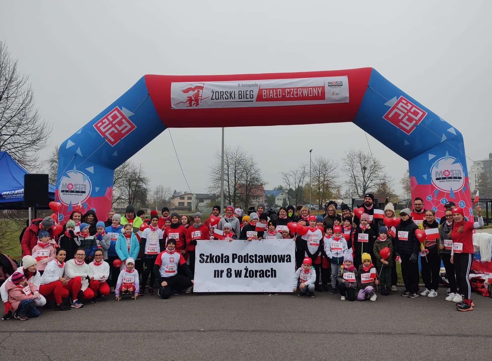 Na zdjęciu społeczność SP-8 Żory po biegu biało-czerwonym w Parku Cegielnia w Żorach.