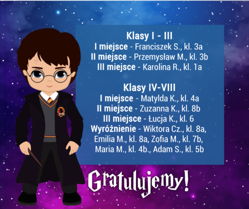Posted on 22 listopada 2021 by szkola8zory Posted in Bez kategorii Przedstawiamy wyniki konkursu czytelniczego „Zaczytani bohaterowie Harry’ego Pottera”. Gratulujemy wszystkim laureatom. Dziękujemy Radzie Rodziców za sfinansowanie nagród. Zapraszamy do galerii Anna Staroń, Adriana Wideł
