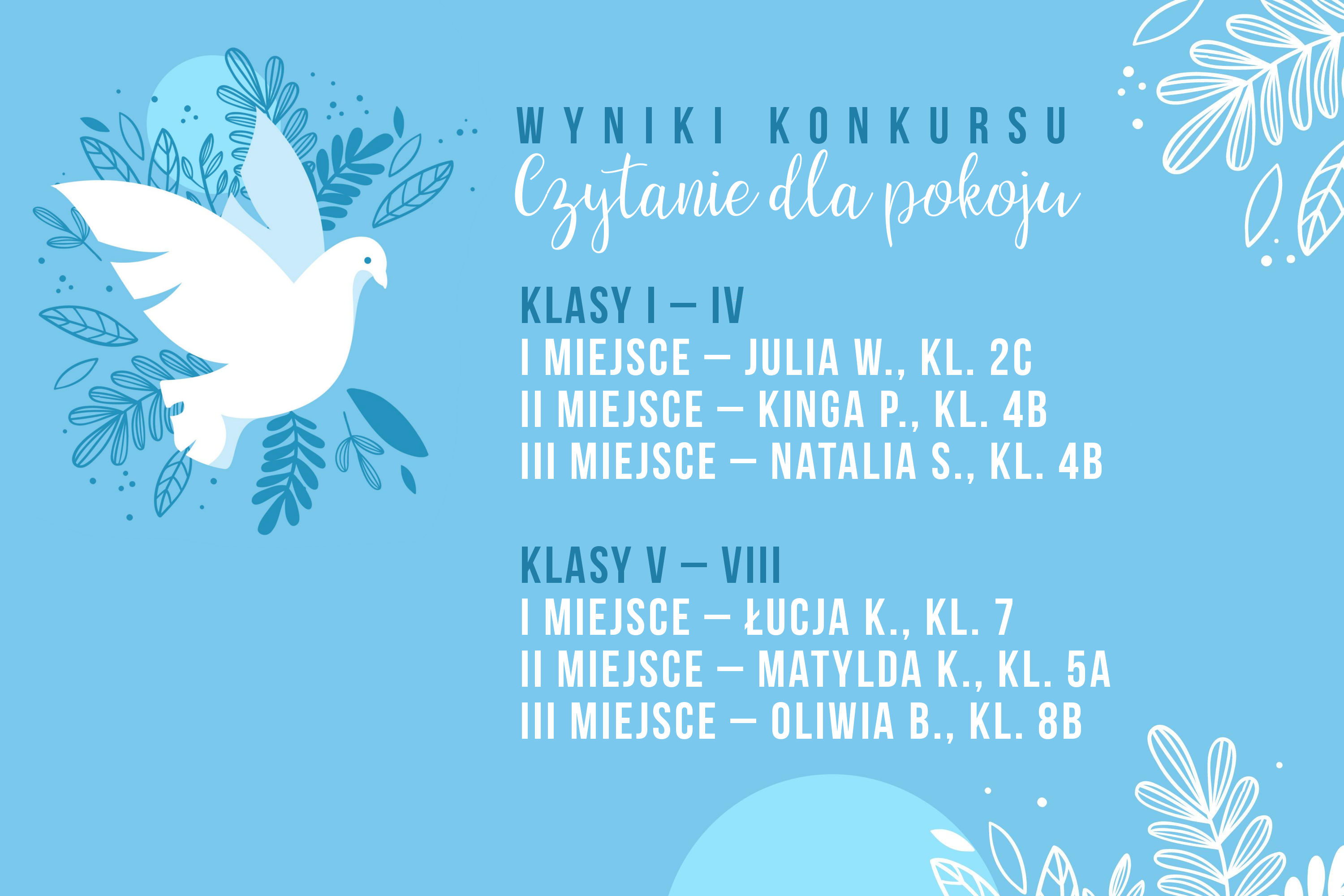Posted on 10 listopada 2022 by szkola8zory Posted in Bez kategorii Przedstawiamy wyniki konkursu „Czytanie dla pokoju”. Gratulujemy laureatom i dziękujemy Radzie Rodziców za sfinansowanie nagród. Na zdjęciach: prace nagrodzone w konkursie Czytanie dla pokoju Anna Staroń