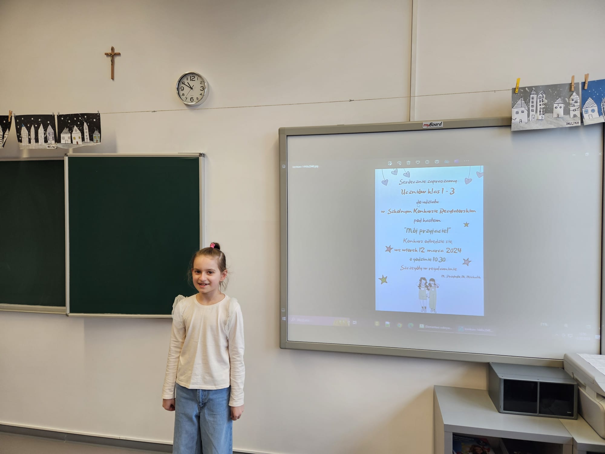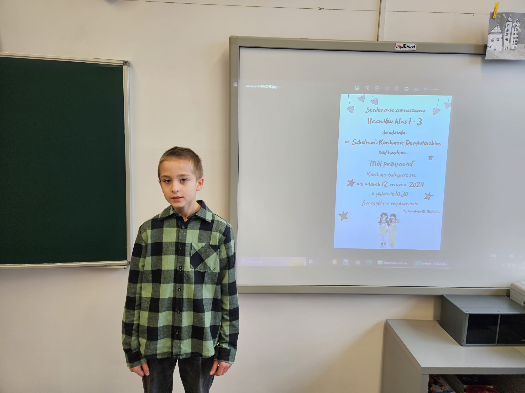 We wtorek 12 marca odbył się Szkolny Konkurs Recytatorski dla klas I – III pod hasłem „Mój przyjaciel”. Celem konkursu było rozbudzanie pasji recytatorskich, doskonalenie umiejętności posługiwania się językiem ojczystym, zachęcanie do wystąpień publicznych, nabycie umiejętności autoprezentacji oraz nauka przyjaznej, zdrowej rywalizacji i współzawodnictwa.Do konkursu zgłosiło się dwunastu uczestników, niestety niektórych pokonała choroba i nie mogli stawić się tego dnia w szkole, aby zaprezentować swój talent. Na szczęście pozostali uczestnicy z wypiekami na twarzy zaprezentowali swoje umiejętności recytatorskie. Wybór laureatów nie był łatwy, wszyscy młodzi recytatorzy prezentowali wysoki poziom, w związku z czym przyznano następujące miejsca: