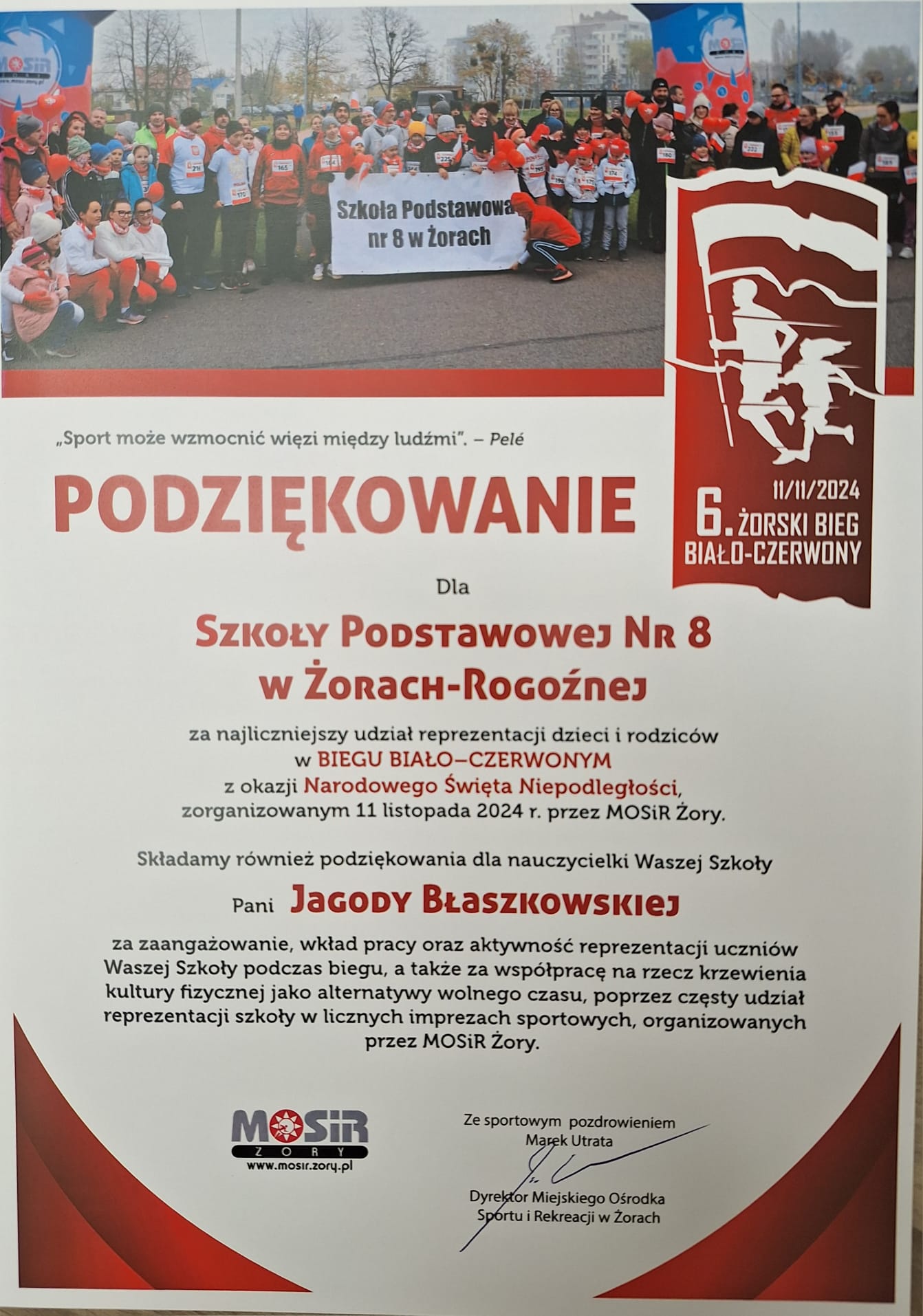 Na zdjęciu: podziękowanie otrzymane od MOSIR ŻORY dla SP-8 ŻORY i dla Jagody Błaszkowskiej-Domagała, jest również logo biegu oraz zdjęcie uczestników Sp8 podczas biegu biało-czerwonych.