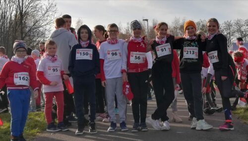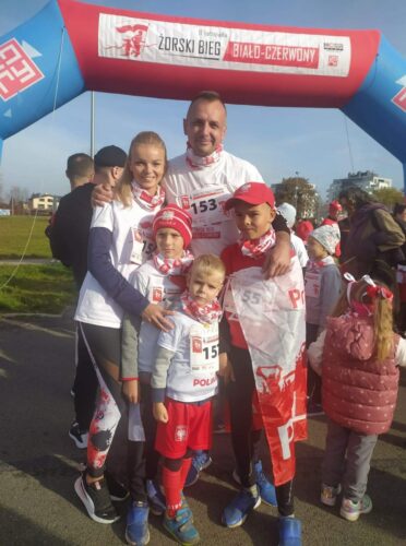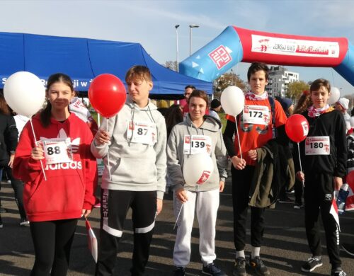 Na zdjeciach: uczniowie wraz z rodzicami podczas Żorskiego Biegu Biało – Czerwonego