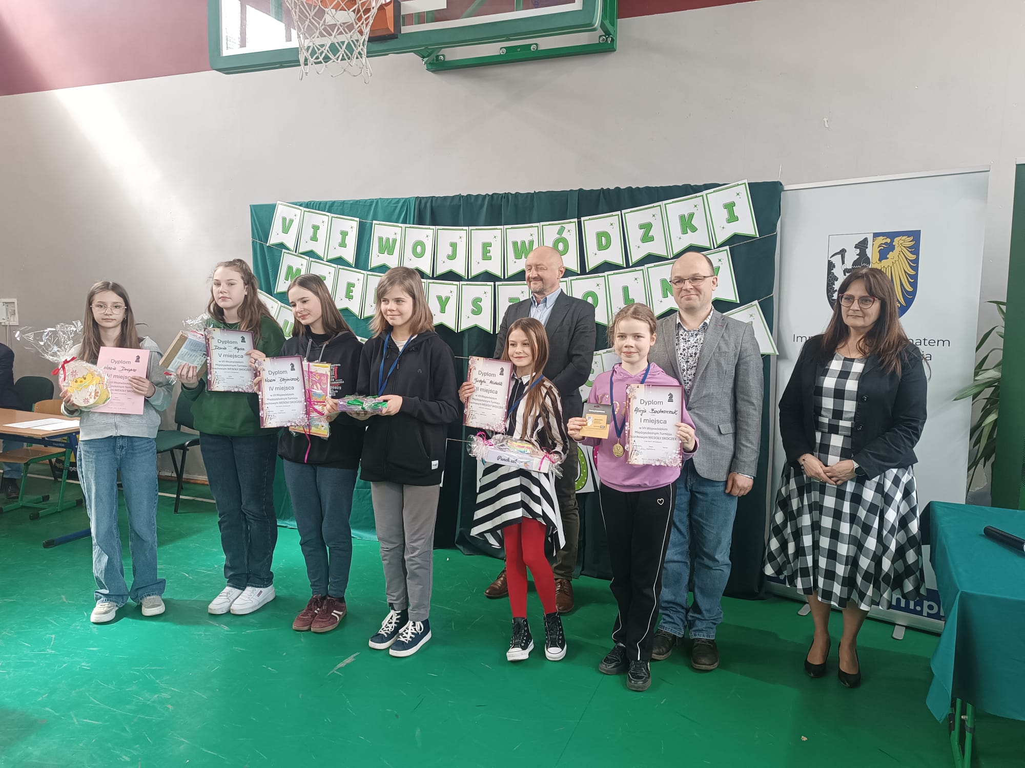 Na zdjęciu: uczniowie naszej szkoły, biorący udział w VII Wojewódzkim Międzyszkolnym Turnieju Szachowym „Wesoły Skoczek” z otrzymanym dyplomem